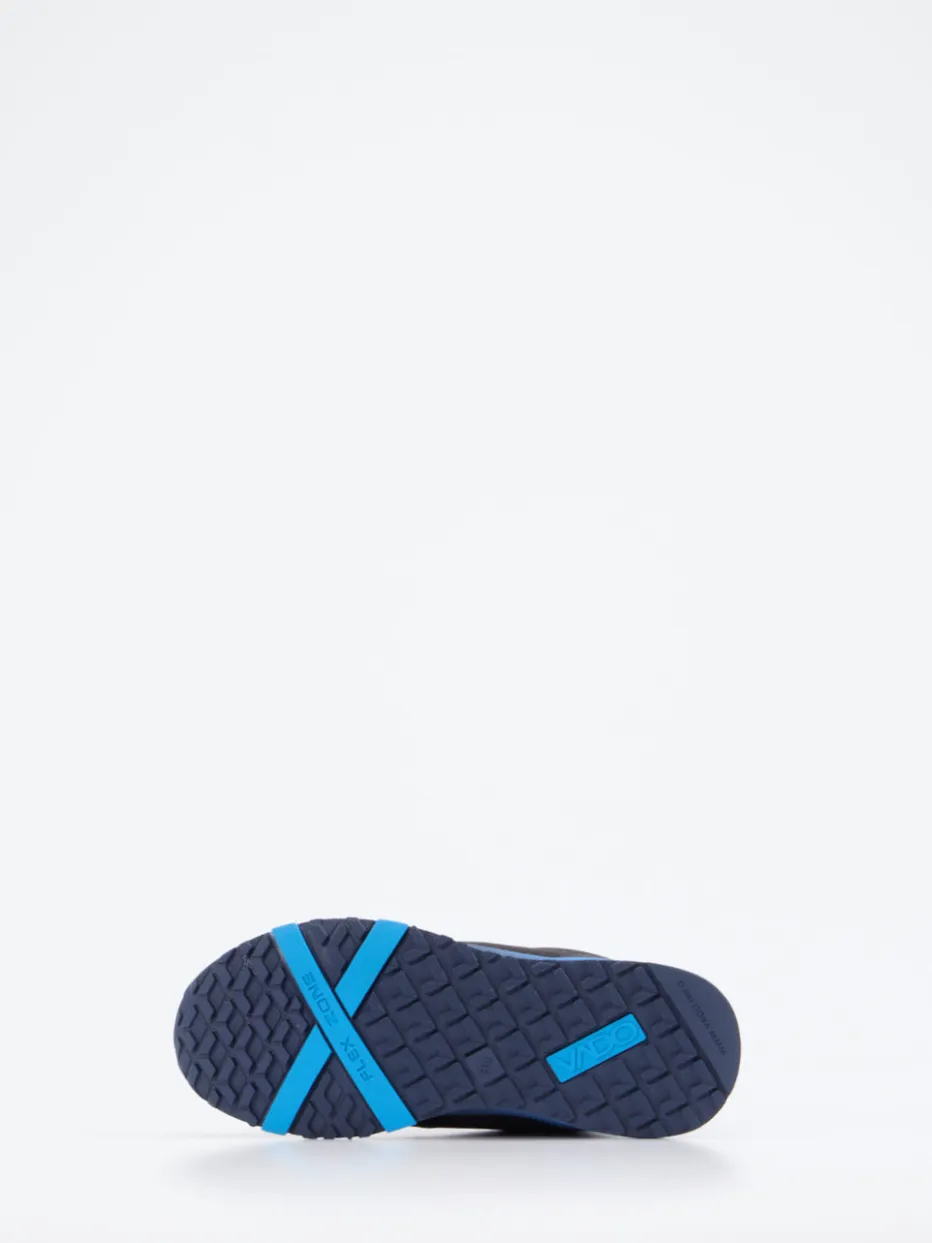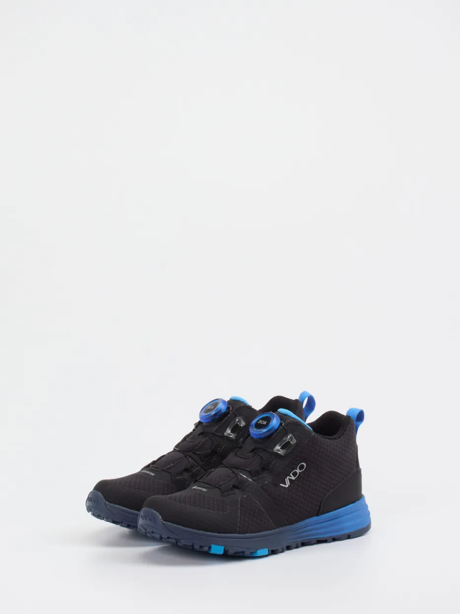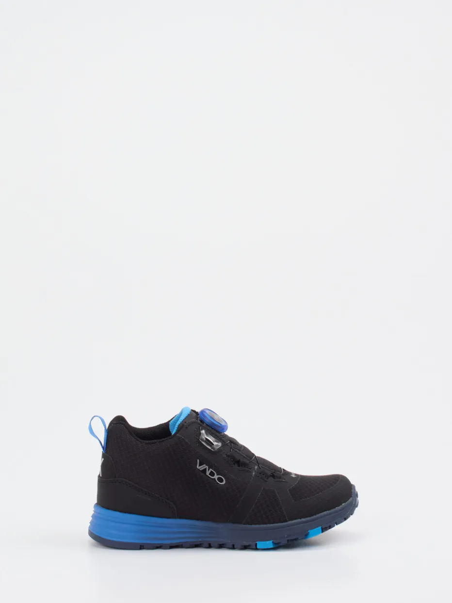 Für Kinder, die draußen mehr vorhaben.Vado präsentiert mit diesem Outdoor-Sneaker einen funktionalen Begleiter für sportliche Kinderfüße. Bei Abenteuern im Freien sorgt das robuste Material aus strukturiertem Textil-Mesh mit synthetischen Verstärkungen für Widerstandskraft und Komfort. Das markante Schwarz wird durch kobaltblaue Akzente modern ergänzt. Die sportlich-kompakte Silhouette vereint mit dem BOA-Drehverschluss zuverlässigen Halt und kinderleichte Bedienung. Eine zweifarbige Gummisohle mit flexibler Zonenmarkierung und reflektierende Details unterstreichen seine Outdoor-Tauglichkeit. Ideal zu Funktionsjacke und Rucksack. Technisches Design trifft auf kindgerechte Funktionalität – Vado setzt Maßstäbe für moderne Kidswear.