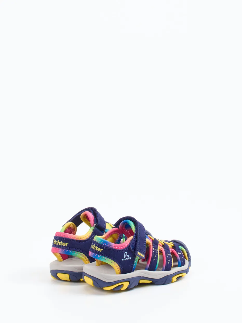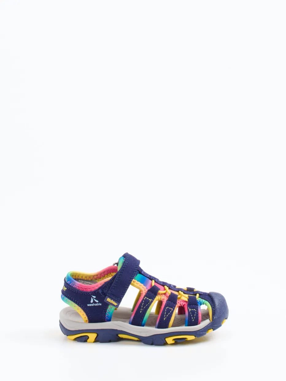 Für aktive Abenteuer im Freien.Die Marke Richter präsentiert eine funktionale Outdoorsandale für Kinder. Ideal für abwechslungsreiche Sommertage: Diese Sandale kombiniert robustes, maschinenwaschbares Textilmaterial mit matter Oberfläche und markanter Farbgestaltung in Dunkelblau, Pink, Gelb und Türkis – ganz im Sinne aktueller Color-Blocking-Trends. Die geschlossene Konstruktion mit Zehenschutz sorgt für Sicherheit bei Outdoor-Aktivitäten, während Klettverschlüsse ein selbstständiges An- und Ausziehen ermöglichen. Eine strukturierte Gummisohle bietet verlässlichen Grip auf verschiedenem Untergrund. Bietet Bewegungsfreiheit mit farbenfrohem Design und alltagstauglichem Komfort – von Richter für kindgerechten Einsatz gedacht.