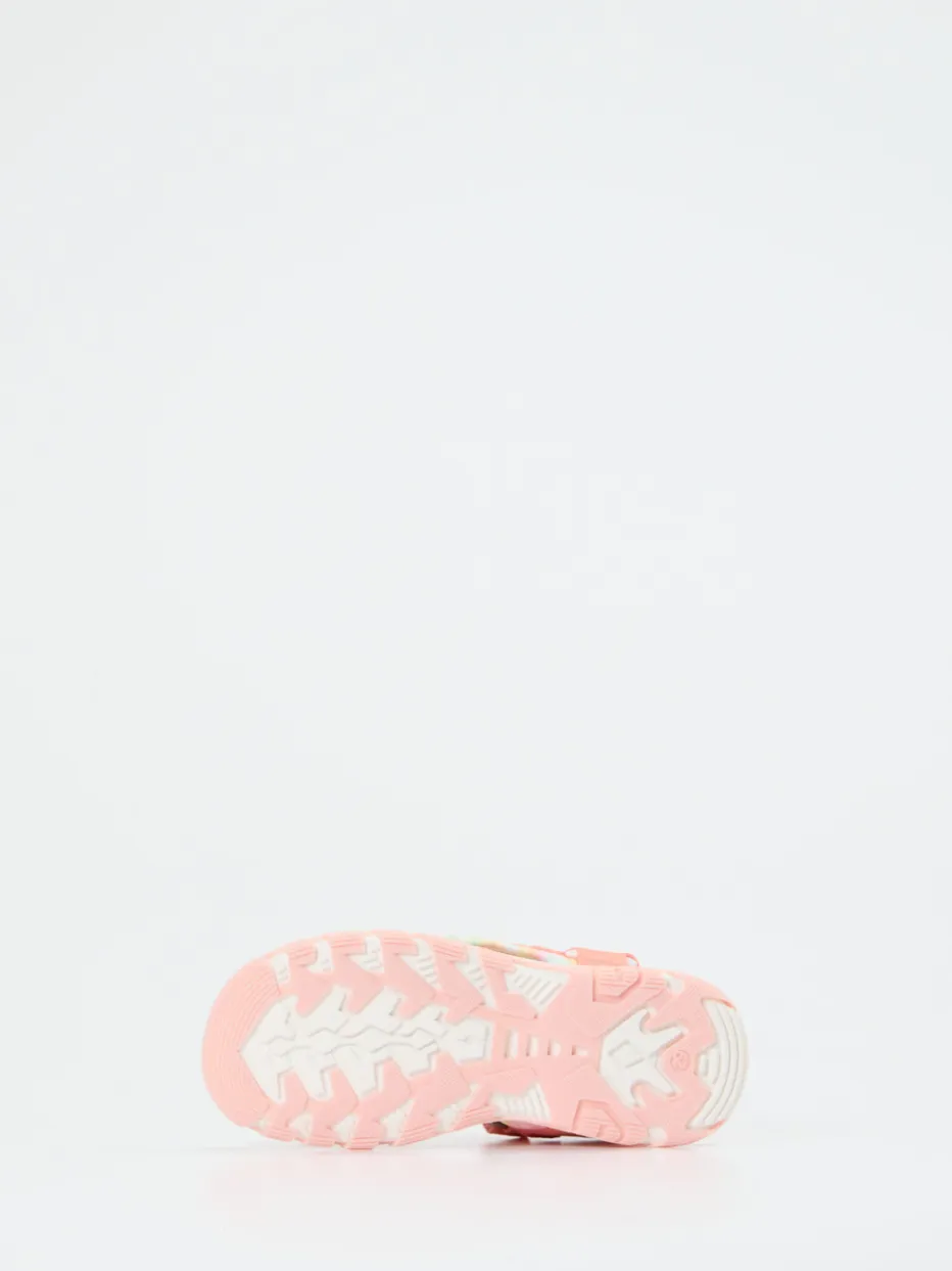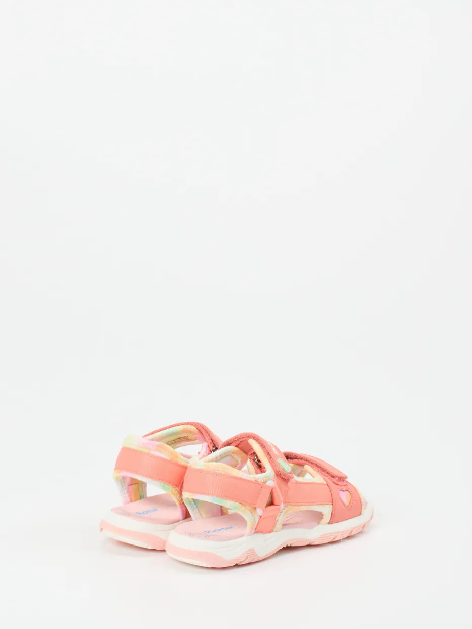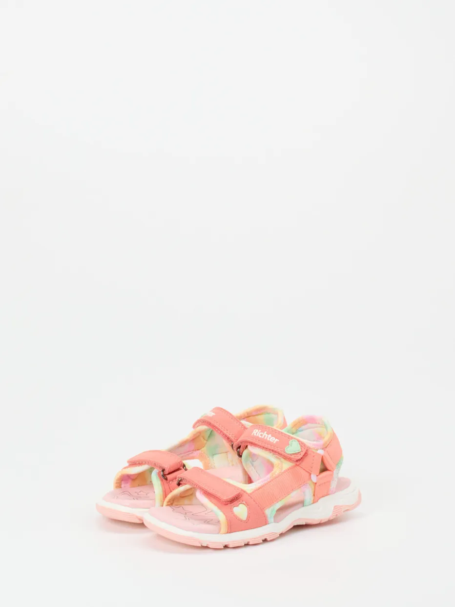 Für kleine Schritte, große Abenteuer.Die Marke Richter präsentiert eine sommerliche Outdoorsandale für Kinder. Ideal für Ausflüge, Spielplatz oder Urlaub am Strand – diese Sandalen überzeugen durch ihr funktionales Design mit weichem Textilmaterial und matt strukturierter Oberfläche. Die korallrosafarbene Gestaltung wird mit pastellgelben und mintgrünen Akzenten sowie Herz-Applikationen ergänzt. Klettverschlüsse sorgen für flexiblen Halt, während gepolsterte Riemen und ein lederbezogenes Fußbett den Tragekomfort erhöhen. Die ergonomisch geformte Profilsohle bietet Trittsicherheit auf verschiedenen Untergründen. Mit ihrer leichten Streetwear-Note und dem Y2K-Einfluss liegen sie modisch im Trend. Richter steht für durchdachte Kinderschuhe mit Alltagstauglichkeit und liebevollen Details.