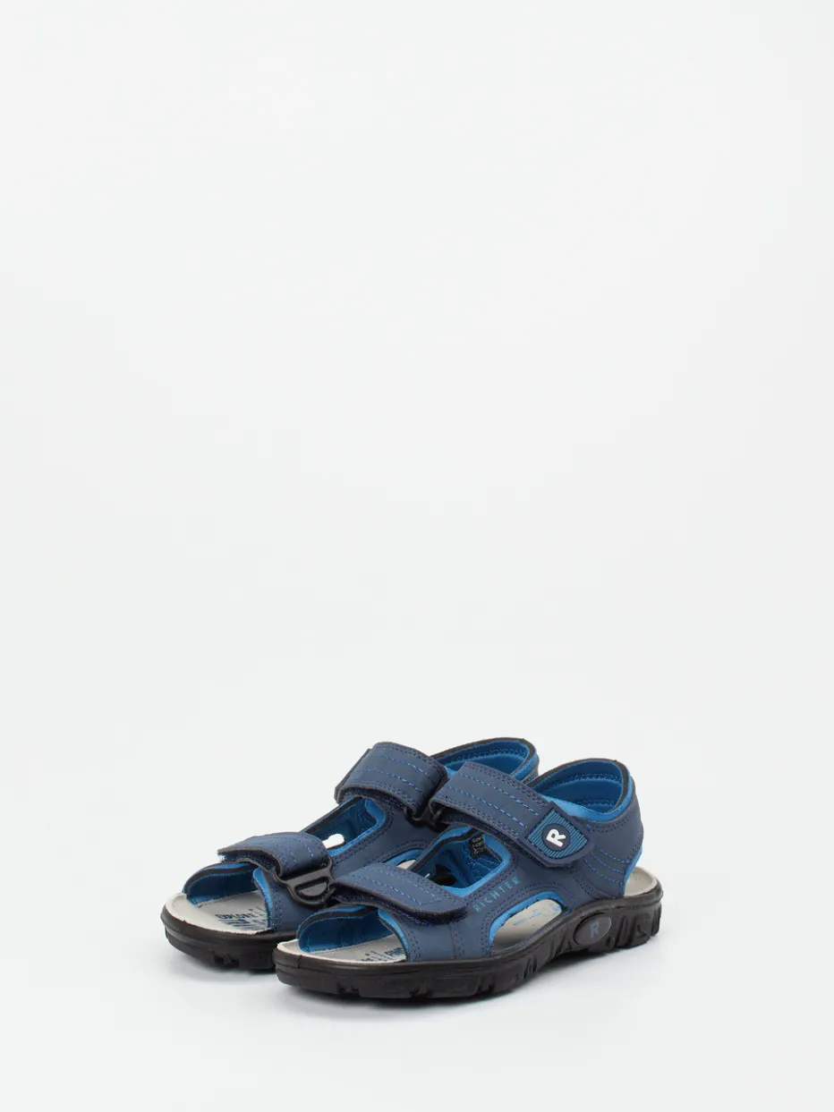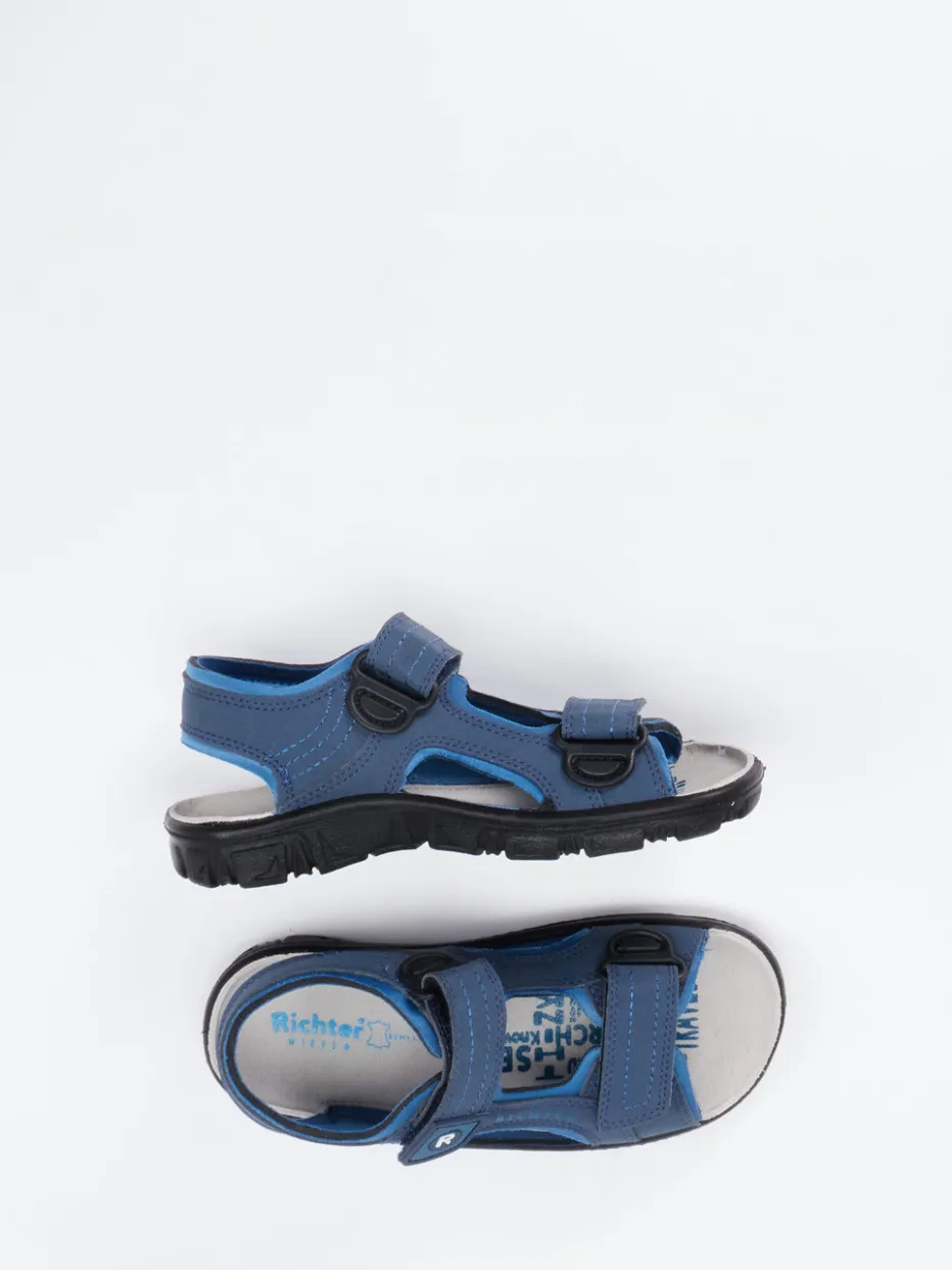 Bereit für Abenteuer.Die Marke Richter präsentiert mit dieser Outdoorsandale ein funktionales Kindermodell für Alltag und Freizeit. Ideal für sommerliche Ausflüge, überzeugt die Sandale durch ihr robustes Textilmaterial mit matter Oberfläche und samtigem Veloursleder. Breite, blau getönte Riemen mit hellblauen Kontrastnähten prägen die offene Silhouette. Zwei praktische Klettverschlüsse sorgen für sicheren Halt, während das lederbezogene Fußbett und die weiche Polsterung hohen Komfort bieten. Die profilierte Gummisohle unterstützt sicheres Gehen auf verschiedenen Untergründen – perfekt für den „Functional Kidswear“-Trend. Marine- und Himmelblau verleihen einen frischen, sportlichen Look. Markentypisch verbindet Richter Alltagstauglichkeit mit kindgerechter Ergonomie.