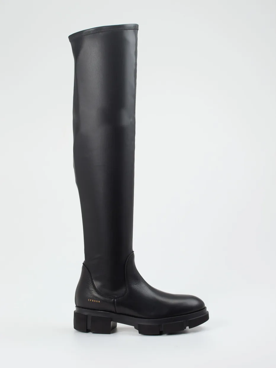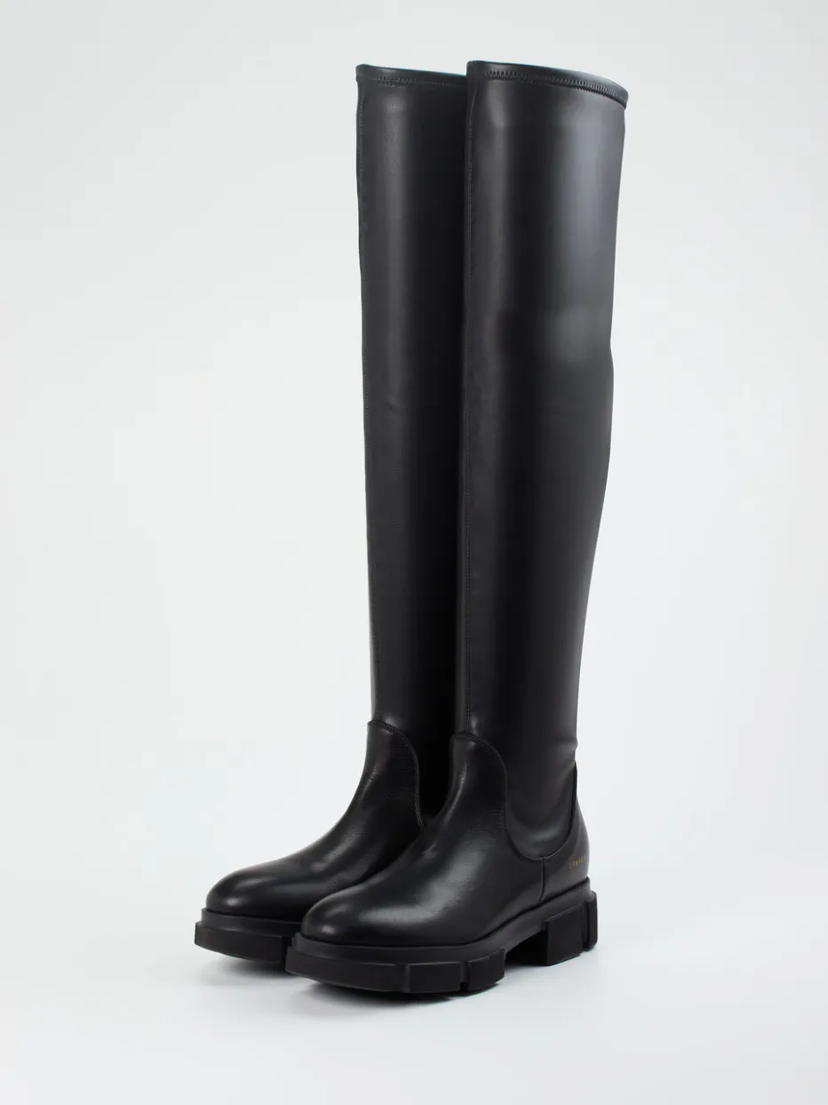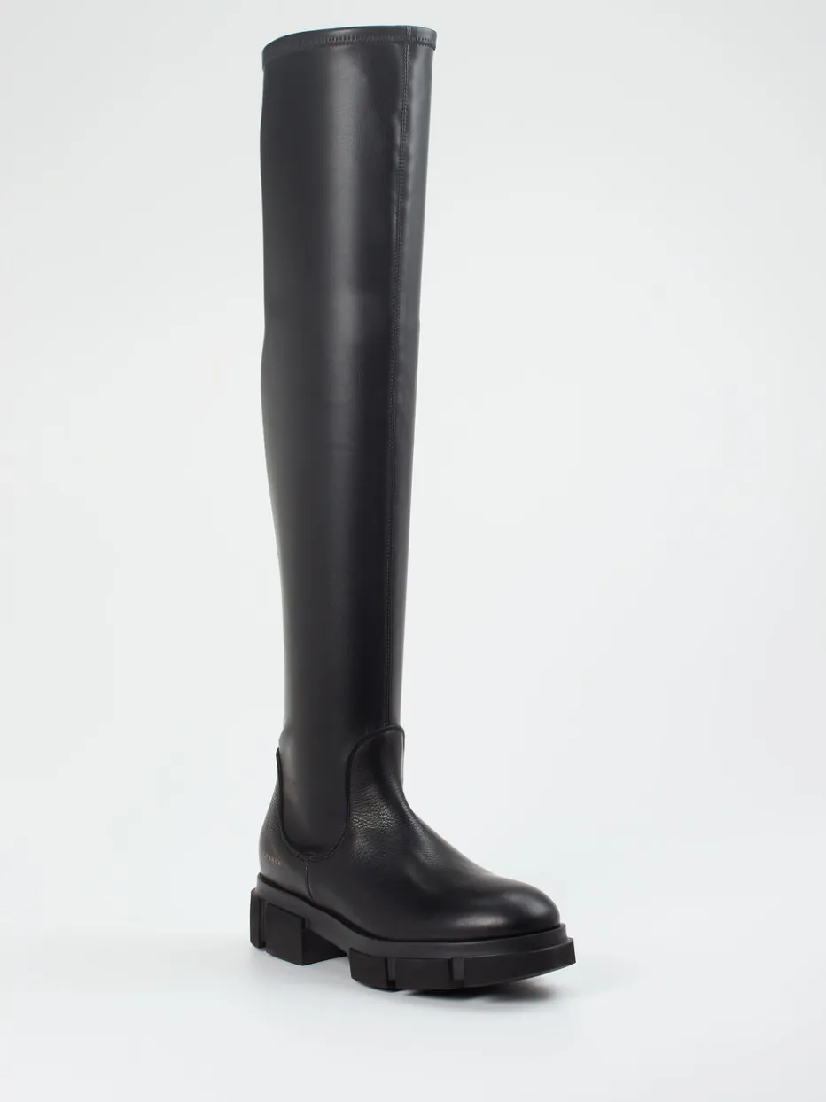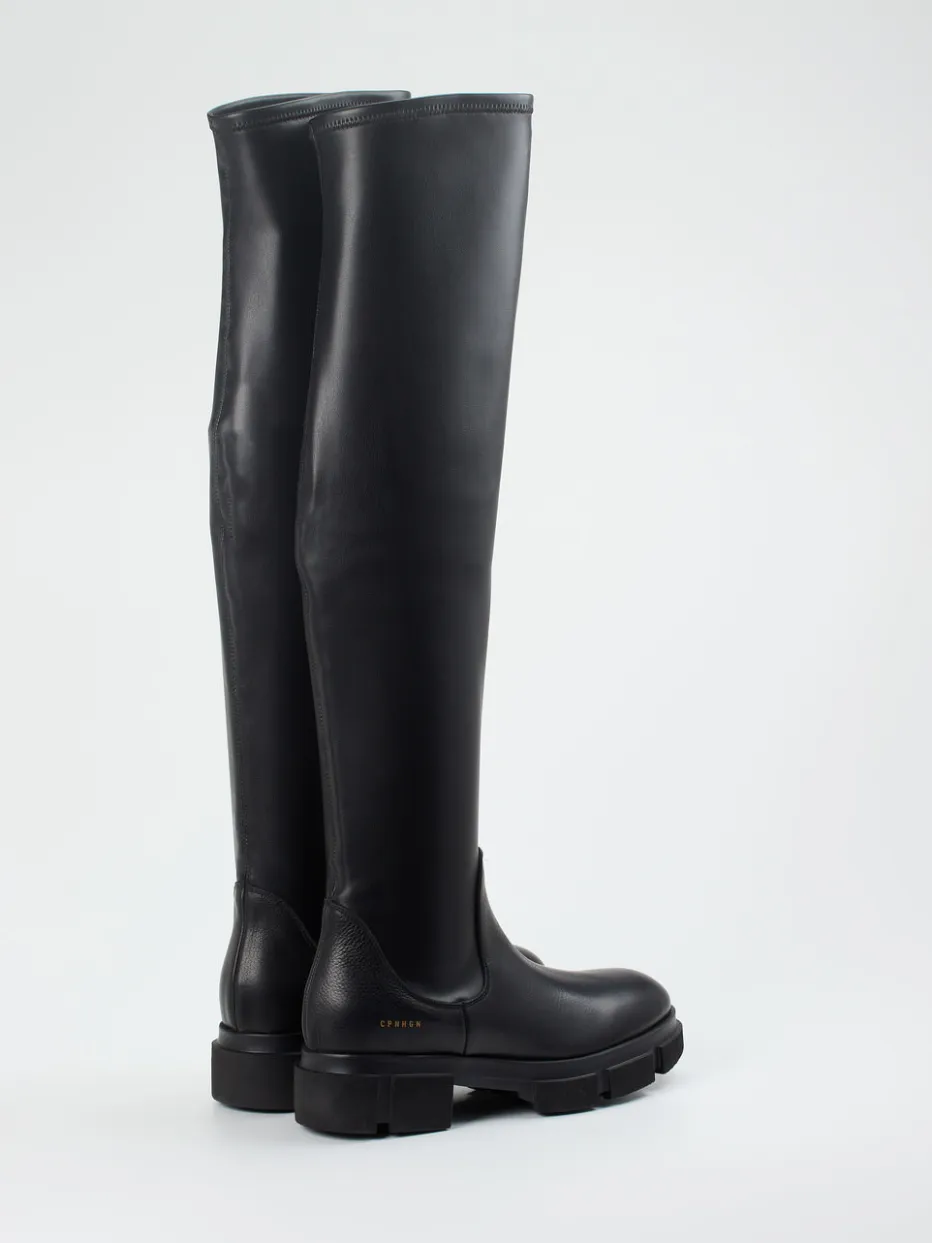 Dieser Overknee-Stiefel von Copenhagen vereint mattes Stretchleder mit markanter Profilsohle – ein Schuh, der stilvollen Minimalismus in urbaner Silhouette verkörpert.