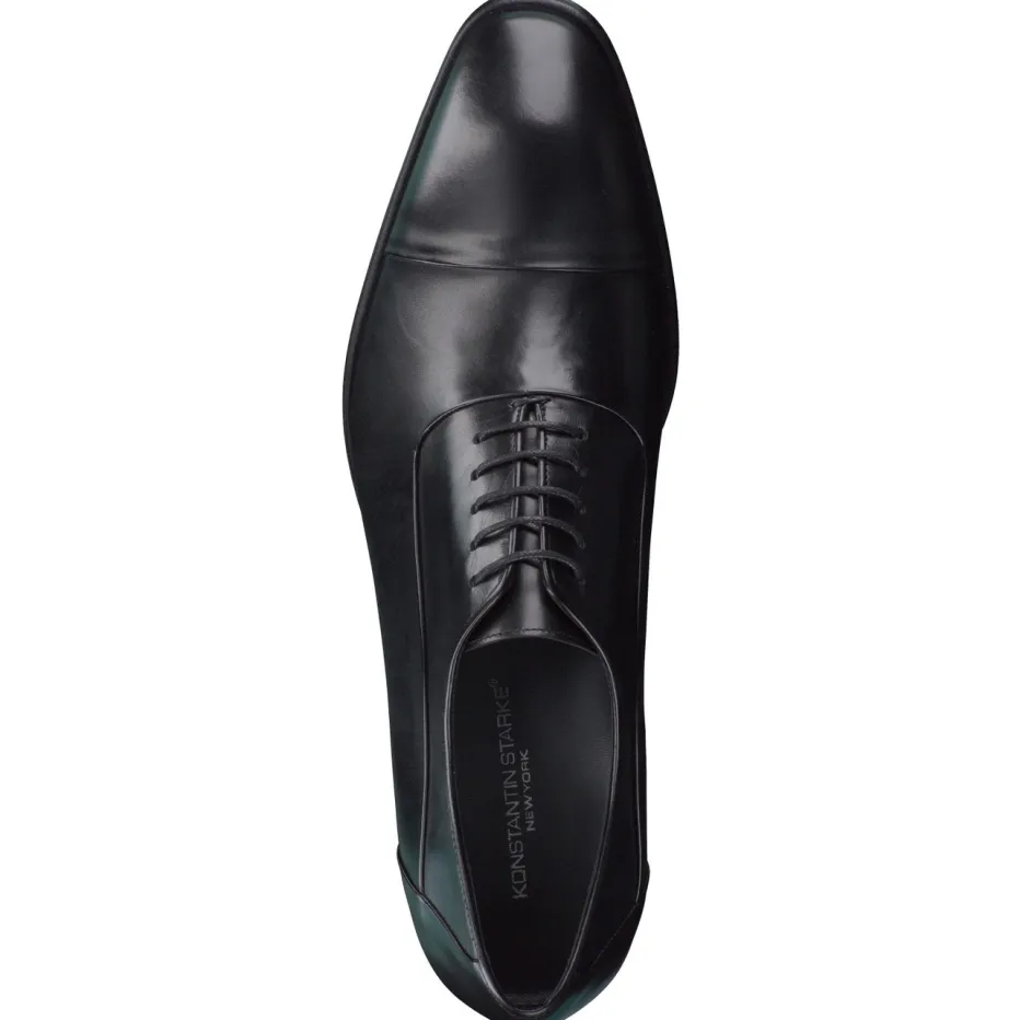 Stilsicherheit für formelle Anlässe.Konstantin Starke präsentiert mit diesem Herren-Schnürschuh einen klassischen Oxford aus hochwertigem Kalbleder. Perfekt für Geschäftstermine oder stilvolle Feiern überzeugt das Modell durch die glänzende, schwarze Oberfläche, eine geschlossene 5-Loch-Schnürung sowie eine akzentuierte Captoe. Die dezente Nahtführung hebt die elegante Linie des schmal zulaufenden Leisten hervor. Eine Ledersohle mit gummiertem Absatz sorgt für einen sicheren Auftritt. Der Schuh greift aktuelle Trends wie „Quiet Luxury“ auf und bewahrt gleichzeitig seine formelle Tradition. Hochwertig kombiniert zu Anzughosen oder dunklem Sakko. Ein echter Business-Klassiker mit kompromissloser Linienführung und exklusiver Materialwahl.