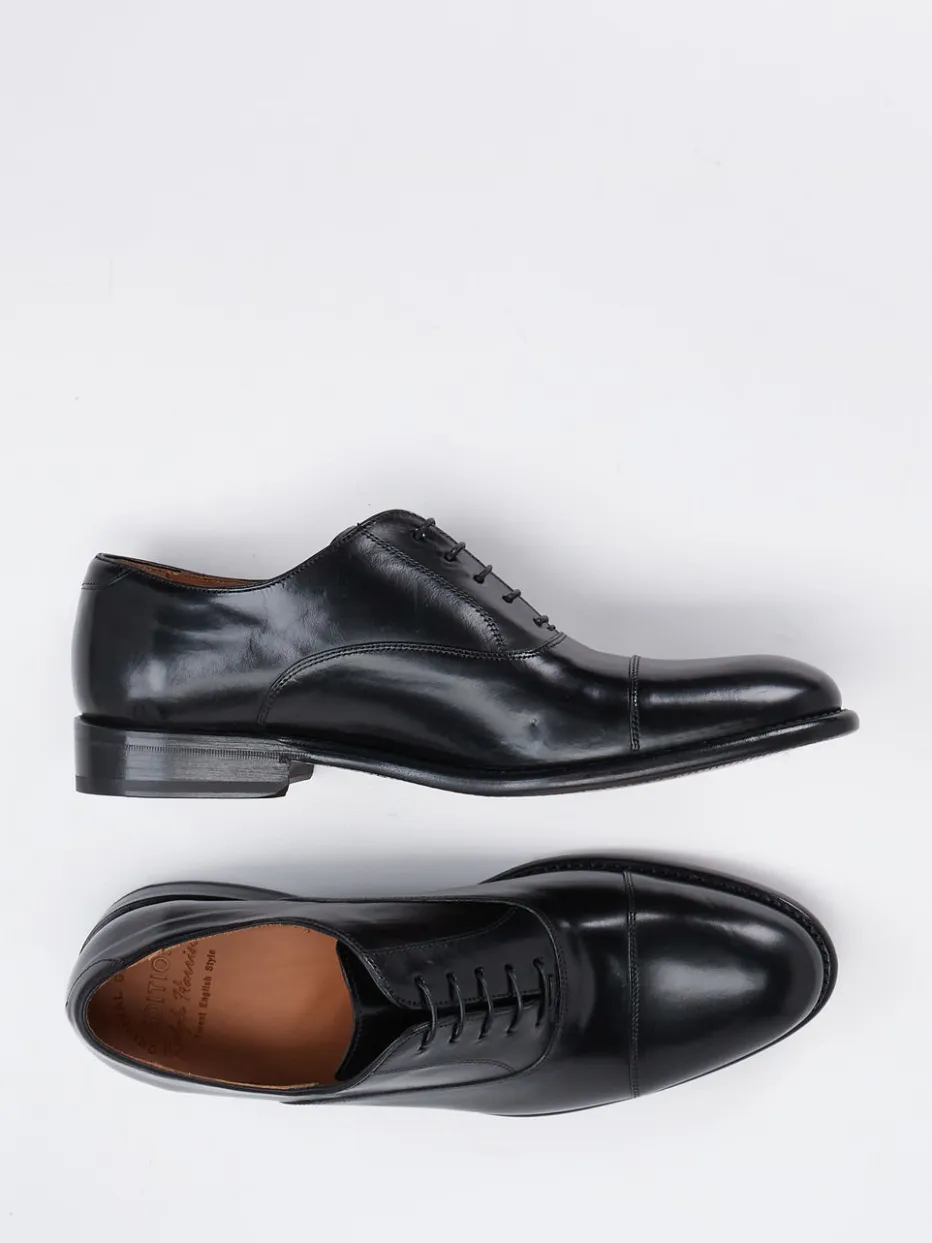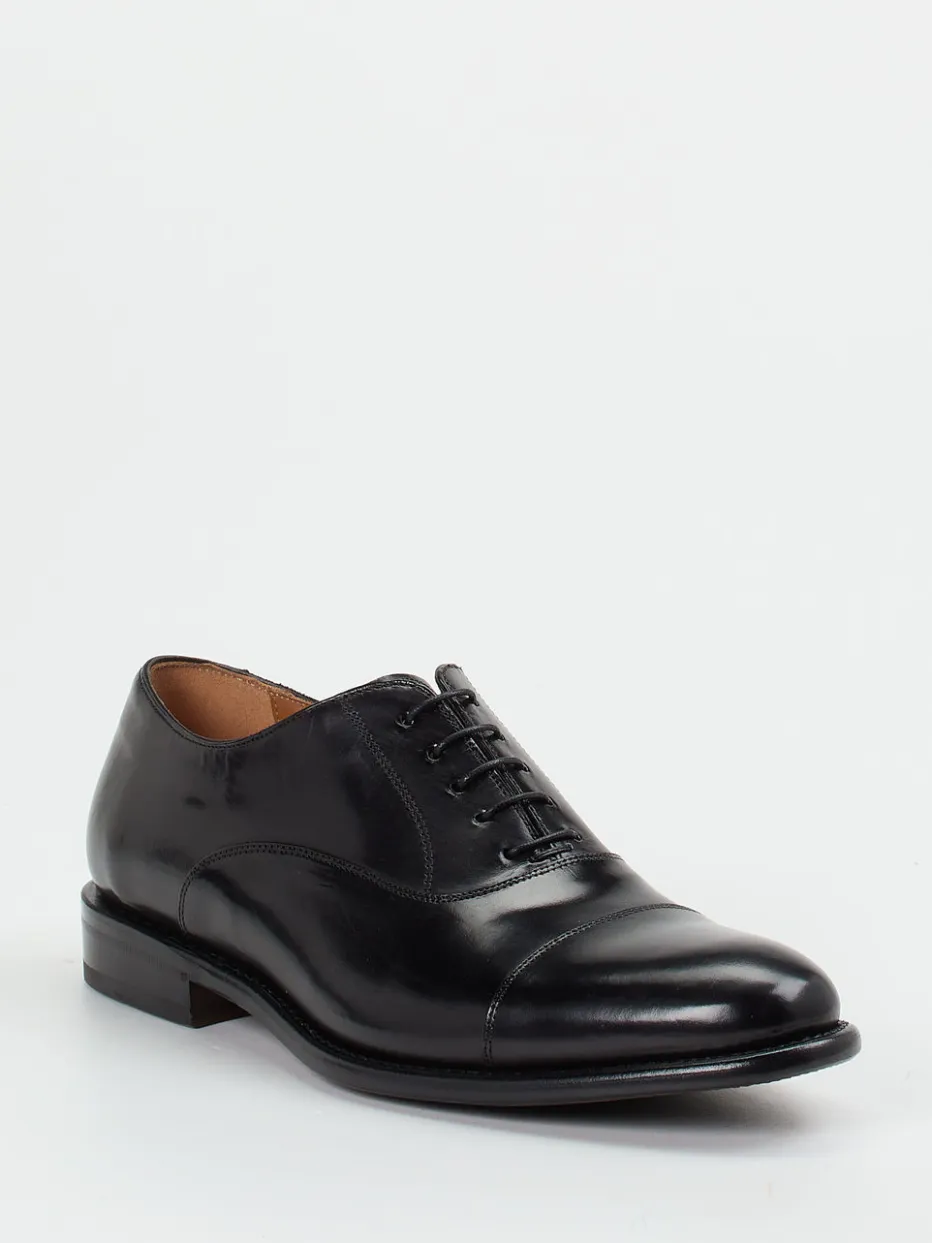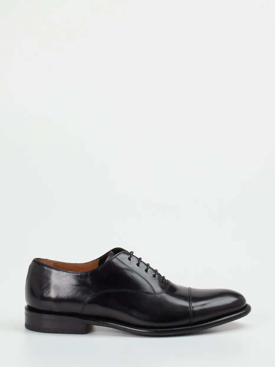 Perfekt für formelle Meetings und elegante Anlässe bietet das Modell stilvolle Zurückhaltung in schwarzem, glänzendem Kalbleder. Die geschlossene Schnürung sowie die klare Kappennaht unterstreichen den schlanken Schnitt. Eine rahmengenähte Ledersohle mit Gummieinsatz kombiniert traditionelles Handwerk mit Alltagstauglichkeit. Ton-in-Ton gehaltene Nähte und das minimalistische Design betonen den „Quiet Luxury“-Charakter. Ideal kombinierbar mit Anzughosen oder eleganten Business-Outfits.
