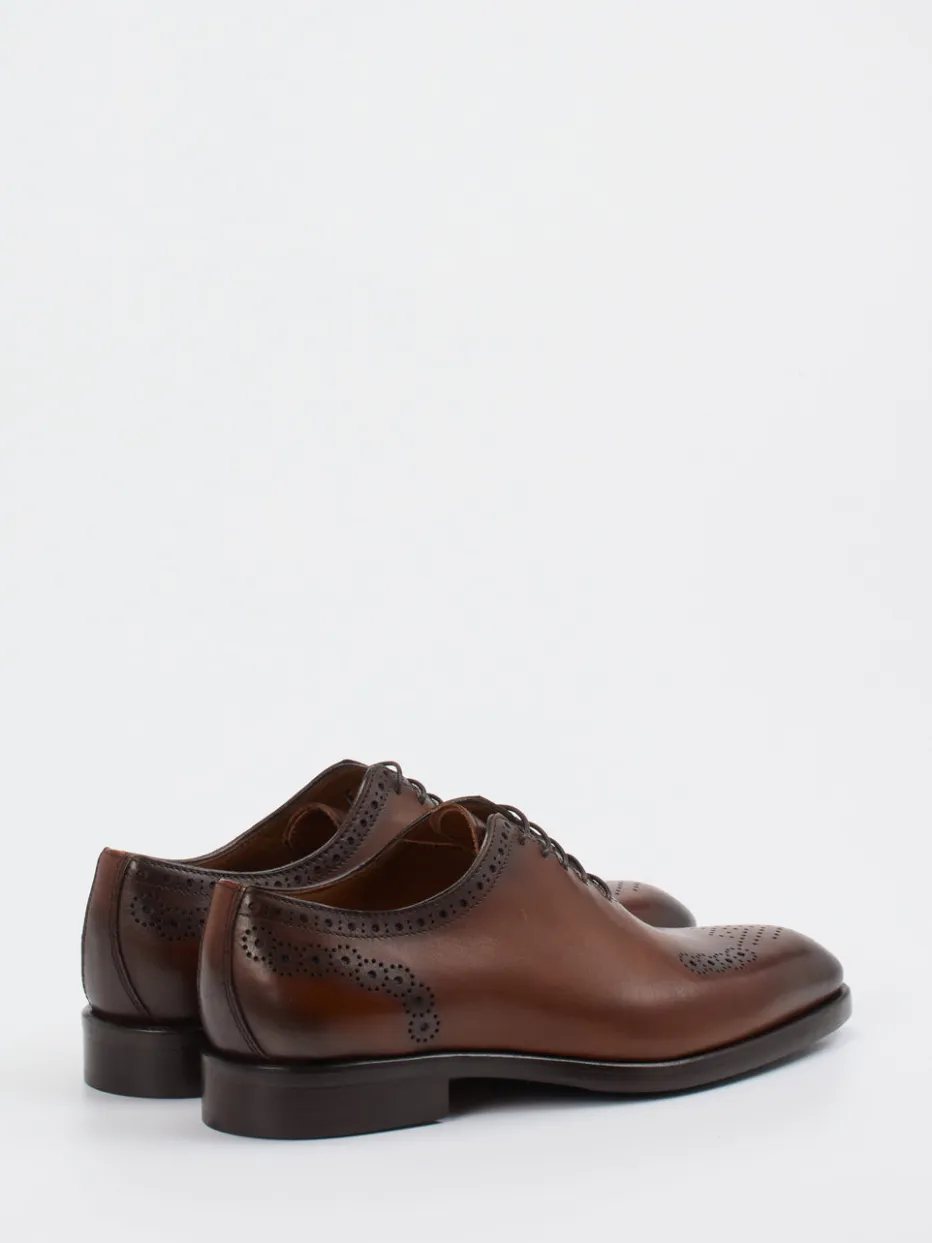 Für formelle Anlässe und den Business-Alltag konzipiert, überzeugt der Schuh mit feinem Kalbleder in glänzender Oberfläche. Die dunkel abgestuften Farbnuancen in Mittel- und Dunkelbraun sowie die präzise Brogue-Lochung schaffen ein anspruchsvolles Design. Die schlanke Silhouette und die klassische Schnürung unterstreichen den traditionsbewussten Charakter. Gummierte Ledersohlenpartien erhöhen die Alltagstauglichkeit durch rutschhemmenden Komfort. Als Teil des „Quiet Luxury“-Trends passt dieser Schuh besonders gut zu Anzughosen oder smarten Office-Kombinationen.