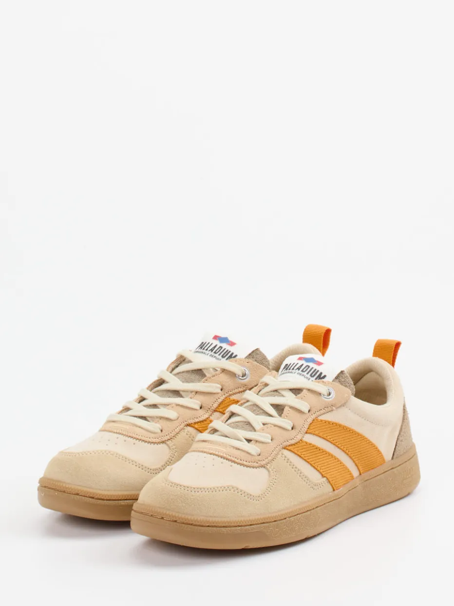 Modernes Design trifft Retro-Sportlichkeit.Palladium zeigt mit diesem Sneaker, wie vielseitig modische Freizeitbegleiter sein können. Ideal für entspannte Citytage oder lässige Urlaubslooks: Der Low-Top-Sneaker kombiniert weiches Veloursleder mit textilem Einsatz und überzeugt in sanftem Beige mit Akzenten in Senfgelb und Taupe. Die klassische, flache Silhouette wird durch eine klare Schnürung, seitliche Streifen und Zuglasche auf der Rückseite ergänzt. Die Gummisohle bietet dabei angenehmen Halt, während Logo-Details den Markencharakter unterstreichen. Die gelungenen Farbkontraste setzen subtile Highlights im Outfit. Ein bequemer Allrounder im angesagten Retro-Stil mit urbanem Komfortanspruch.