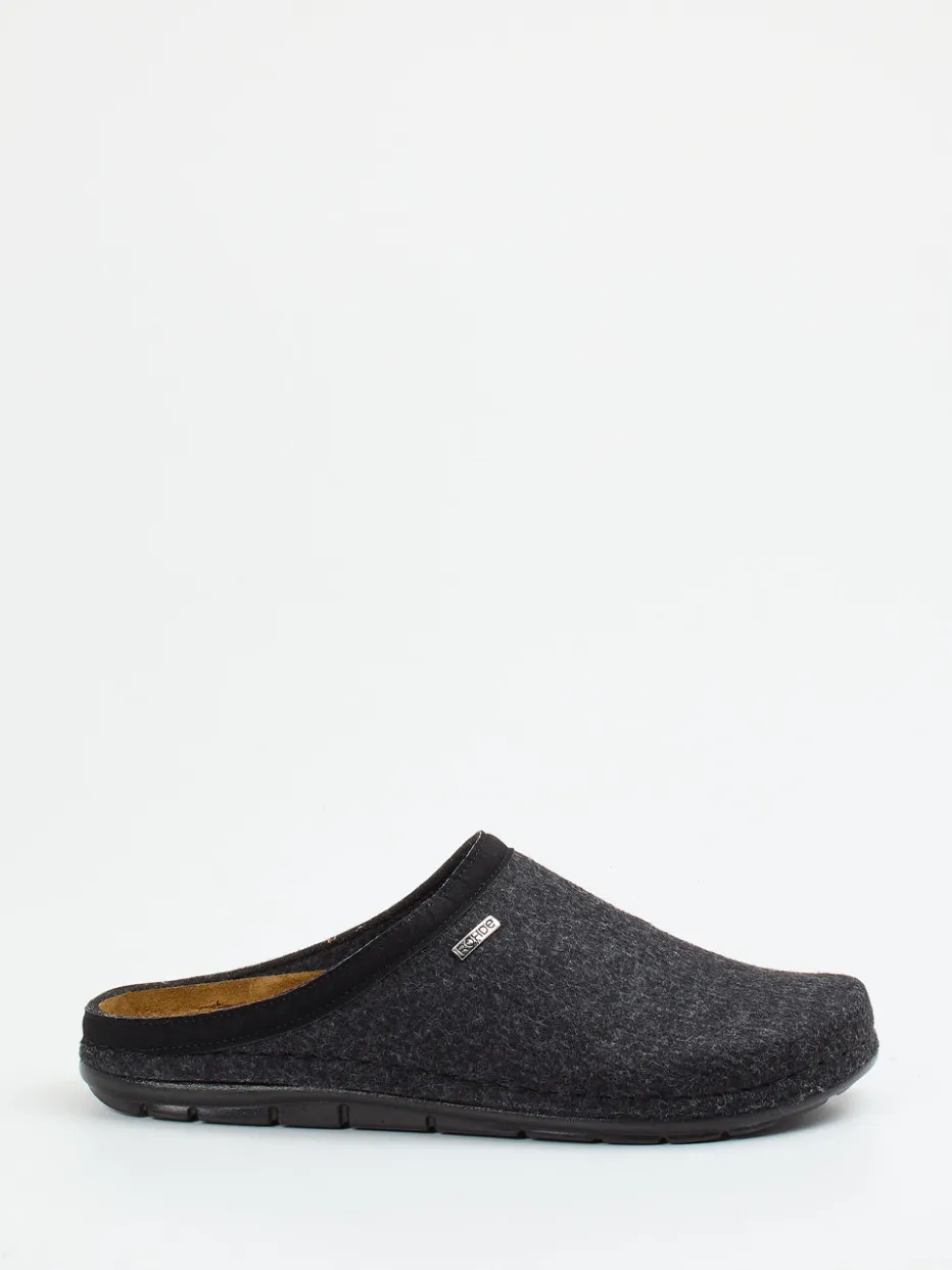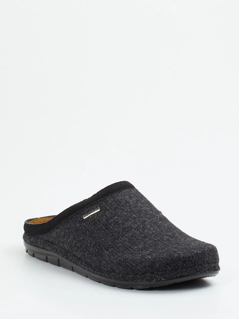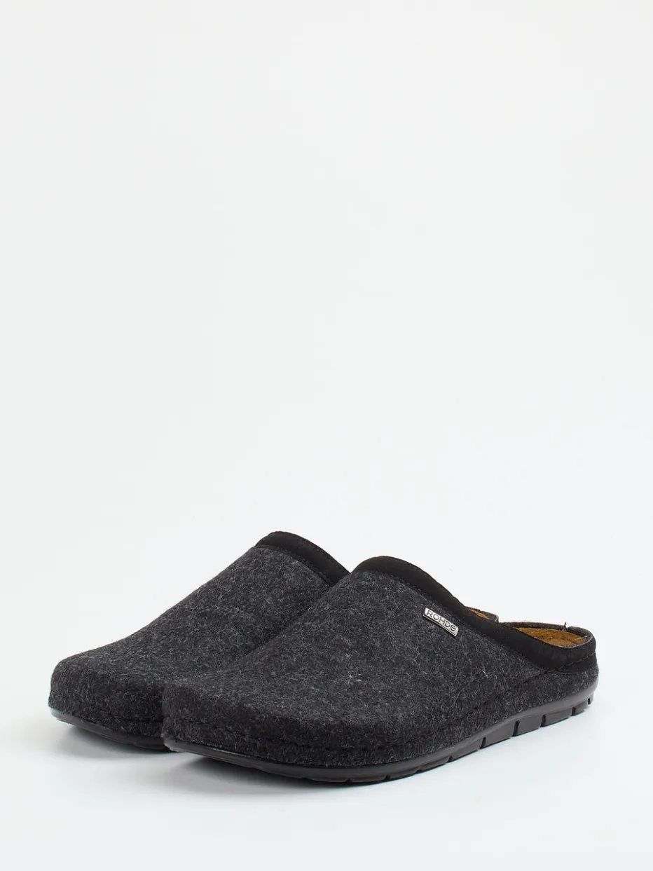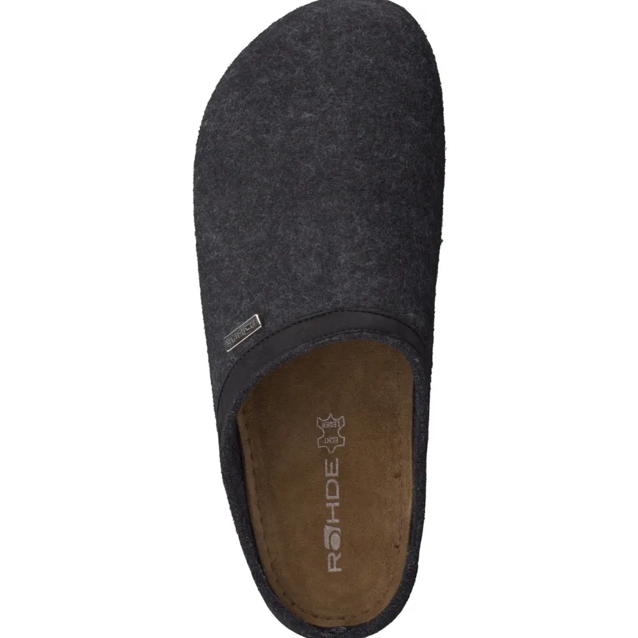 Wärme und Komfort für entspannte Stunden.Rohde präsentiert mit diesen Pantoffeln eine bequeme Lösung für den Wohnbereich. An kühlen Abenden bieten sie wohlige Wärme und sicheren Halt. Das anthrazitgraue Filzmaterial mit weich-melierter Oberfläche verleiht dem Schuh eine angenehm zurückhaltende Optik. Eine anatomisch geformte Lederdecksohle sorgt für hohen Tragekomfort, während die profilierte PU-Laufsohle samt integriertem Dämpfungselement rutschfestes Gehen im Haus ermöglicht. Der klassische Clog-Schnitt mit offenem Fersenbereich erleichtert das Hineinschlüpfen. Dank zurückhaltendem Farbkonzept und filigranem Metall-Logo ideal kombinierbar mit Loungewear sowie Homewear-Trends der Saison. Reduziertes Design trifft auf ausgesuchten Komfort von Rohde.