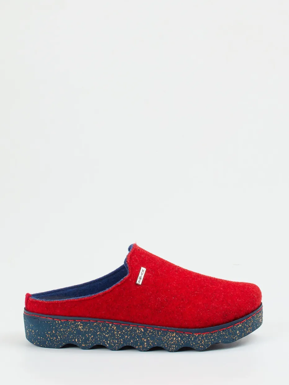 Die kräftige Farbe in Signalrot vereint sich mit hochwertigem, samtig strukturiertem Filz zu einem markanten Look, ergänzt durch das dunkelblaue Innenfutter aus Softfilz. Die ergonomisch designte, gesprenkelte Profilsohle bietet sicheren Halt auf glatten Böden und zeigt ein bewusst nachhaltiges Element durch den Recycling-Anteil. Offene Ferse und unkomplizierter Einstieg unterstreichen die Alltagstauglichkeit – perfekt für alle, die Komfort und Ästhetik im Wohnbereich schätzen. Passt ideal zu Loungewear in gedeckten Tönen.