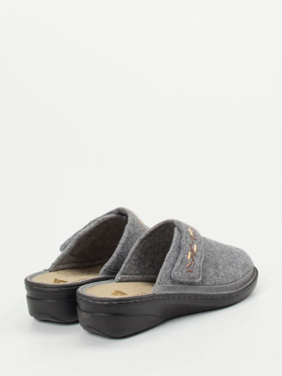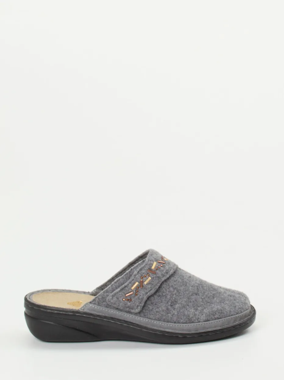 Der mitteltönige Graufilz mit filziger Haptik sorgt an kühlen Tagen für wohlige Wärme. Eine leicht erhöhte Gummisohle in Keilform unterstützt durch ergonomische Entlastung, während edle Stickdetails in Gold und Kupfer visuelle Akzente setzen. Die Form ist vorne geschlossen und hinten offen – so gelingt bequemes Hineinschlüpfen. Inspiriert vom Trend zu Soft Textures und Quiet Luxury bieten diese Pantoffeln ein harmonisches Gleichgewicht aus Funktion und Design. Optimal kombinierbar mit loungetauglicher Homewear oder Kuschelsocken.