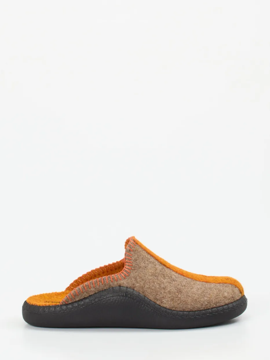 Gefertigt aus braunem Filz mit filziger Oberfläche, umhüllt der Hausschuh den Fuß angenehm warm. Eine orangefarbene Kontrastnaht sorgt für visuelles Highlight im minimalistisch-skandinavischen Stil. Die ergonomisch strukturierte Gummisohle gibt sicheren Halt und unterstützt den Auftritt spürbar. Durch die offene Ferse in Schlupfform gelingt das An- und Ausziehen mühelos. Kombiniert mit einem flauschigen Hausanzug entsteht ein durchgängiger Relax-Look.