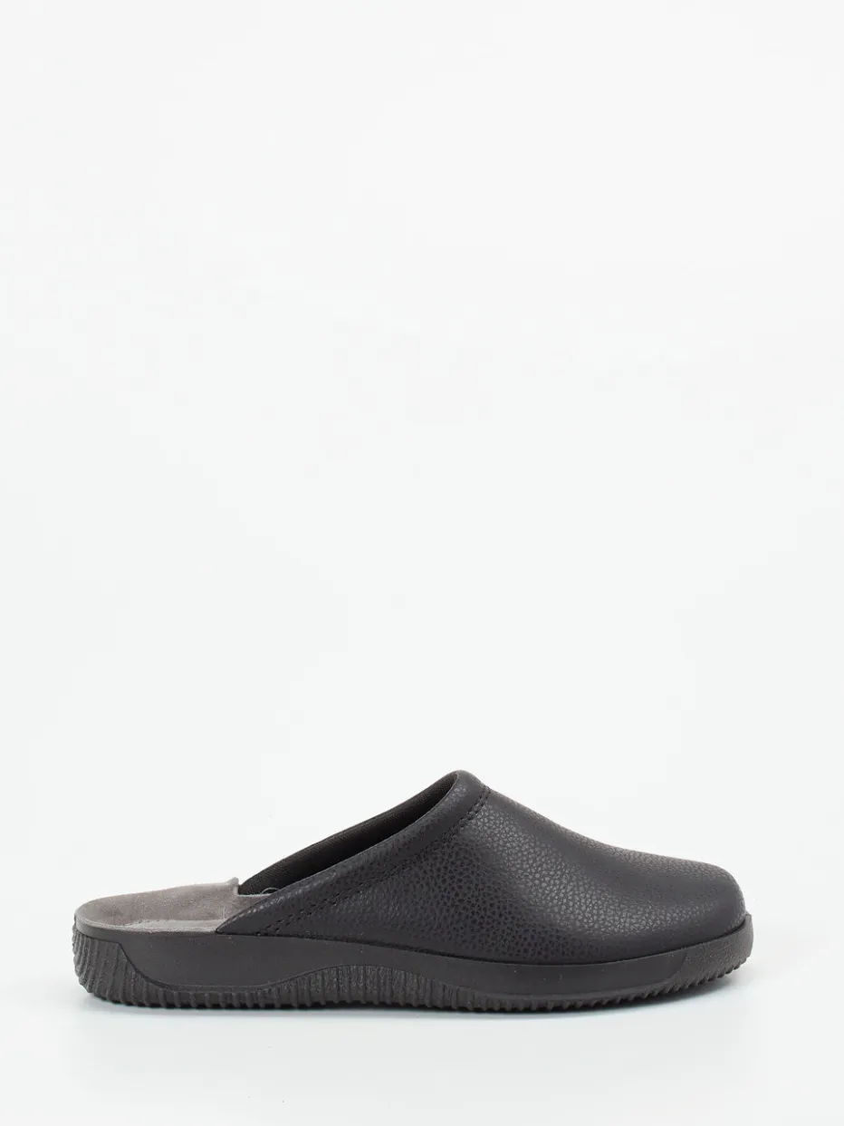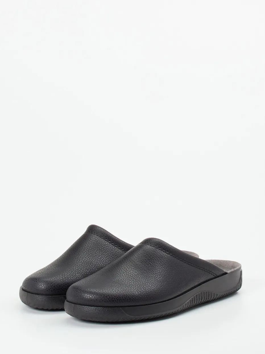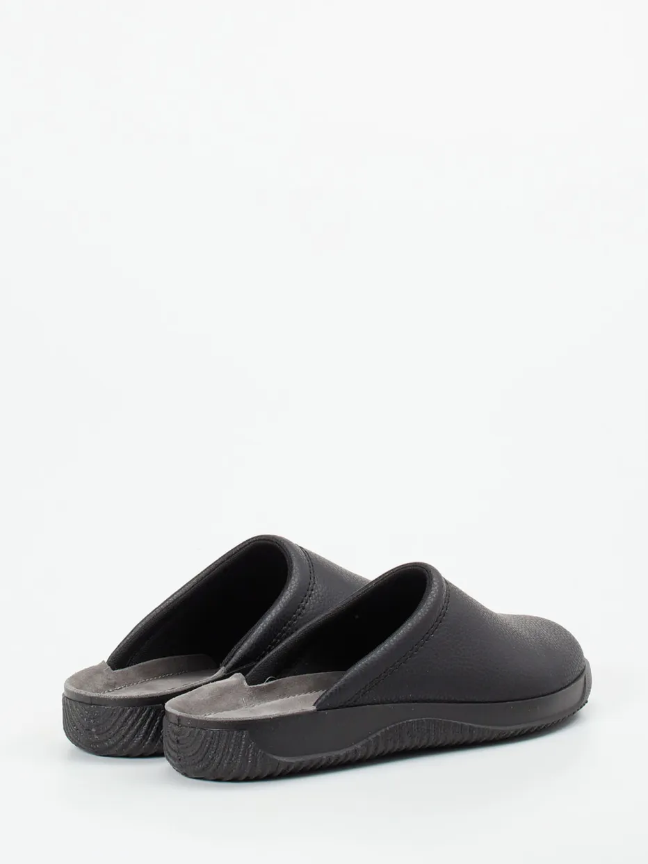 Reduziert auf Komfort.Rohde präsentiert bequeme Pantoffeln in Unisex-Passform für entspannte Stunden zu Hause. Ideal für gemütliche Tage am Wochenende oder nach Feierabend überzeugt das Modell durch hochwertiges, genarbtes Kalbleder in elegantem Schwarz. Die geschlossene Front mit offener Ferse und das ergonomisch gepolsterte Kunstleder-Fußbett sorgen für angenehmes Hineinschlüpfen. Das dezente graue Textilfutter ergänzt das reduzierte Design harmonisch. Mit rutschhemmender PU-Sohle und klarer Silhouette ist dieser Hausschuh stilistisch im Bereich Quiet Luxury und Loungewear anzusiedeln. Lässt sich hervorragend zu Loungewear oder kuscheligen Socken kombinieren. Ein zeitloser Wohlfühlklassiker mit funktionaler Raffinesse aus dem Hause Rohde.
