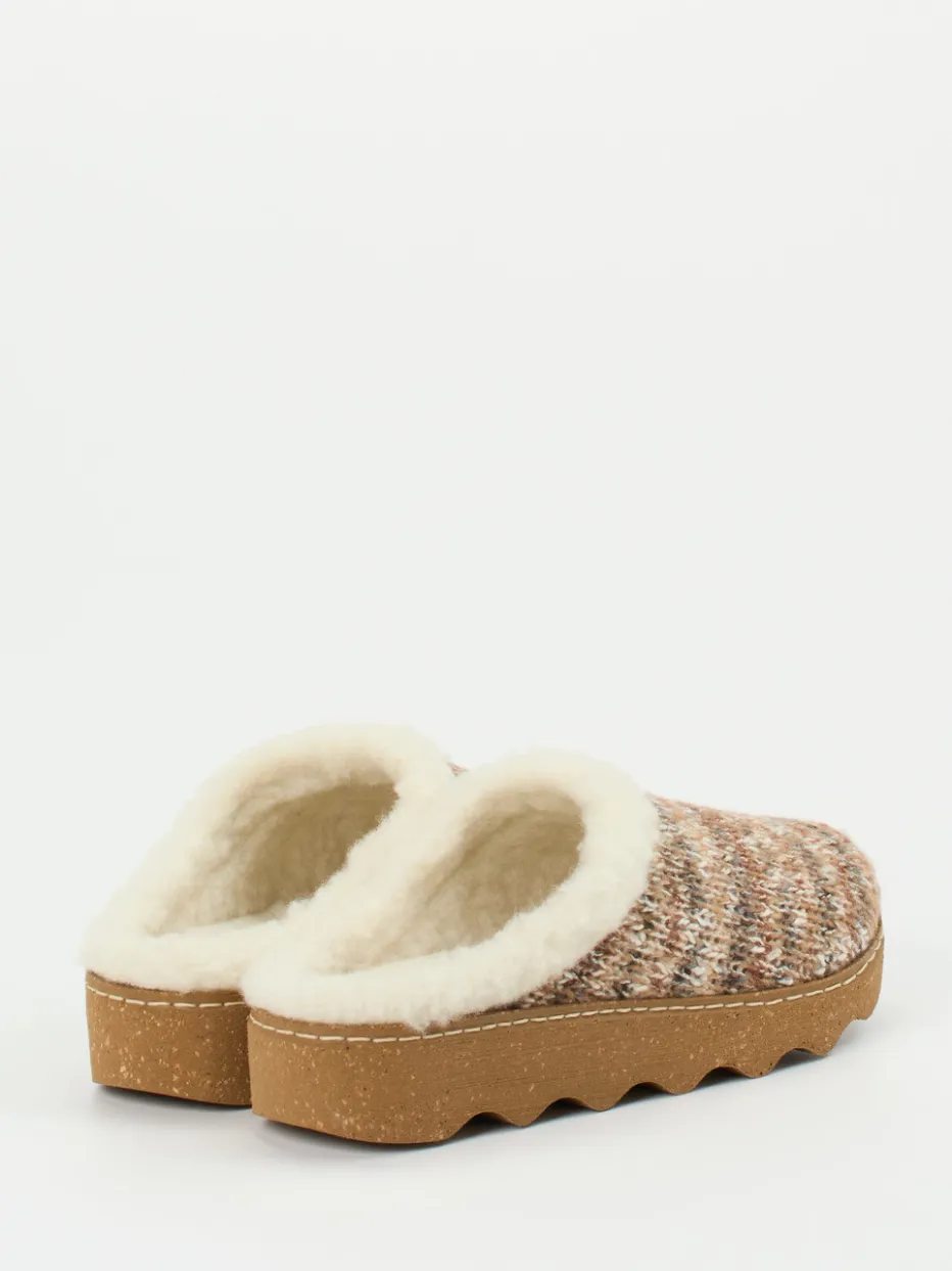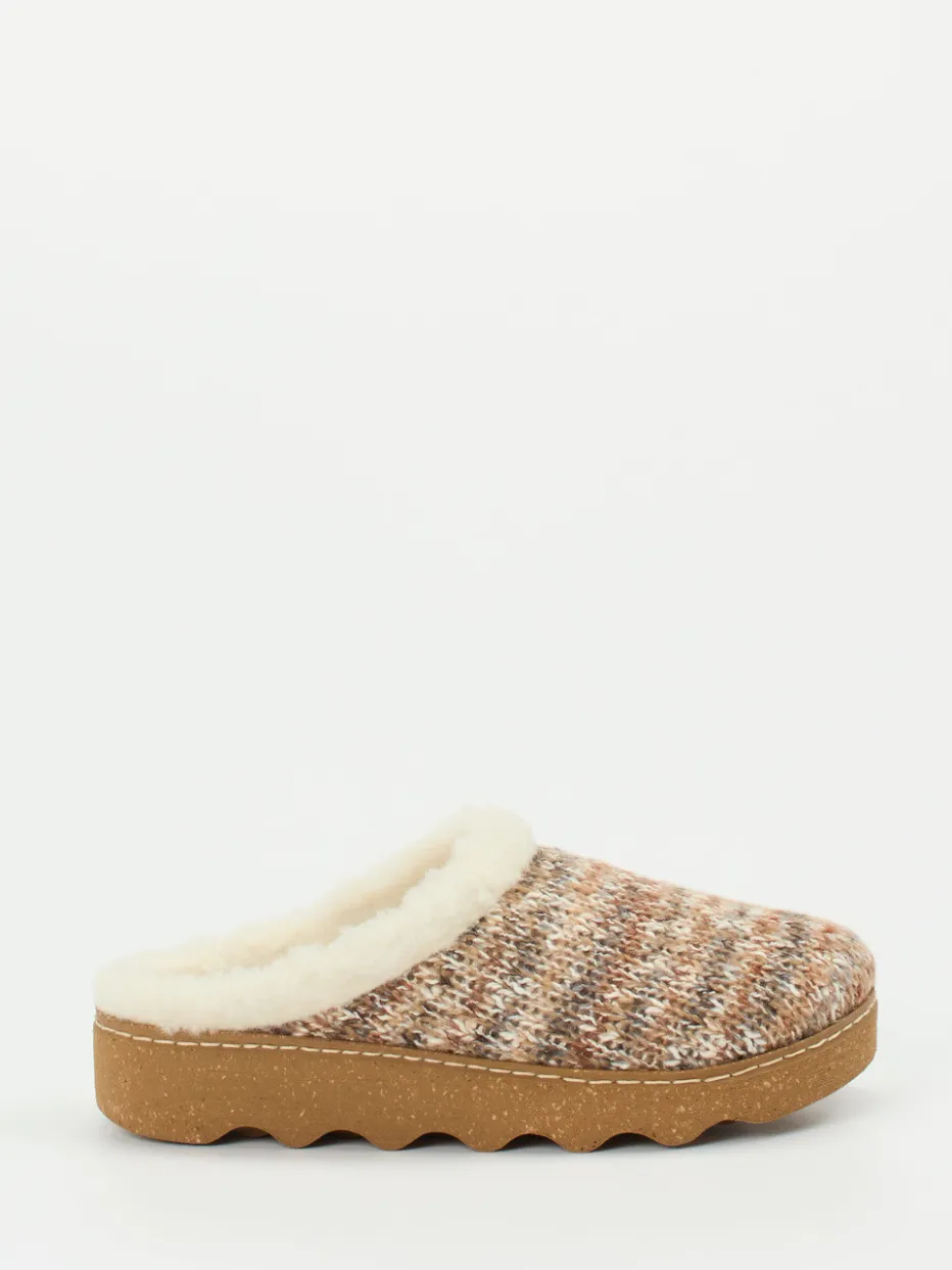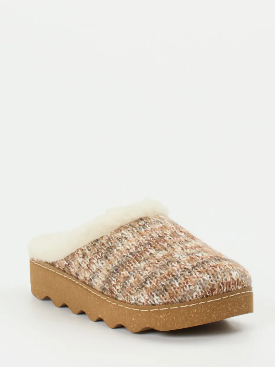 Ideal für gemütliche Stunden daheim: Das gestrickte Textilmaterial in melierter Mittelbraun-Optik verbindet Wohnlichkeit mit moderner Loungewear-Ästhetik. Ein satt gefütterter Einstieg mit Microfaser und Schurwoll-Anmutung sorgt für wohlige Wärme. Die geschlossene, rund zulaufende Silhouette wird durch eine profilierte, braune Porosohle in Korkoptik ergänzt, die trittsicheren Halt auf glatten Böden gewährleistet. Dezente Kontrastnähte betonen den handwerklichen Charakter, inspiriert vom Hygge-Trend. Kombinierbar mit Strickleggings oder flauschigem Morgenmantel.