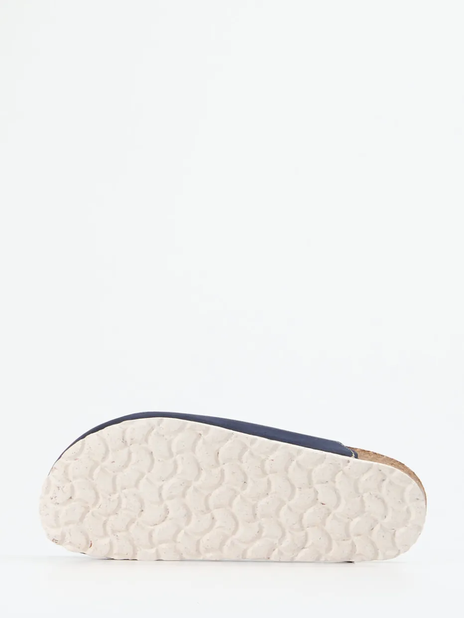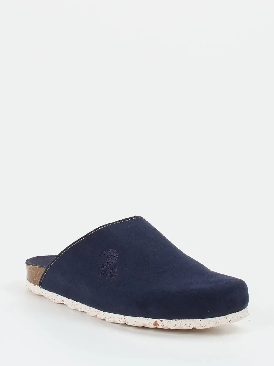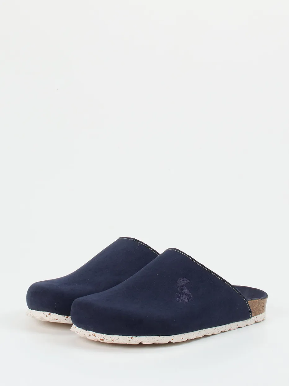 Form trifft Funktion im Alltag.Die Marke Thies erweitert ihr Hausschuh-Sortiment mit diesen dunkelblauen Pantoffeln für Damen und Herren. Ob auf dem Parkettboden oder der Terrasse – das samtige Veloursleder mit matter Oberfläche vermittelt ein natürliches Tragegefühl. Die ergonomisch geformte Kork-Zwischensohle und die profilierte Gummisohle sorgen für Halt und Komfort. Das Modell kommt ohne Verschluss, zeigt eine geschlossene, hinten offene Form und überzeugt durch dezente Ton-in-Ton-Stickerei sowie eine sichtbare Kontrastnaht an der Öffnung. Inspiriert vom Loungewear-Stil, passt es ideal zum entspannten Wohlfühl-Look. Der Mix aus nachhaltigen Naturmaterialien und klarer Formensprache steht für zeitgemäße Leichtigkeit im Zuhause.