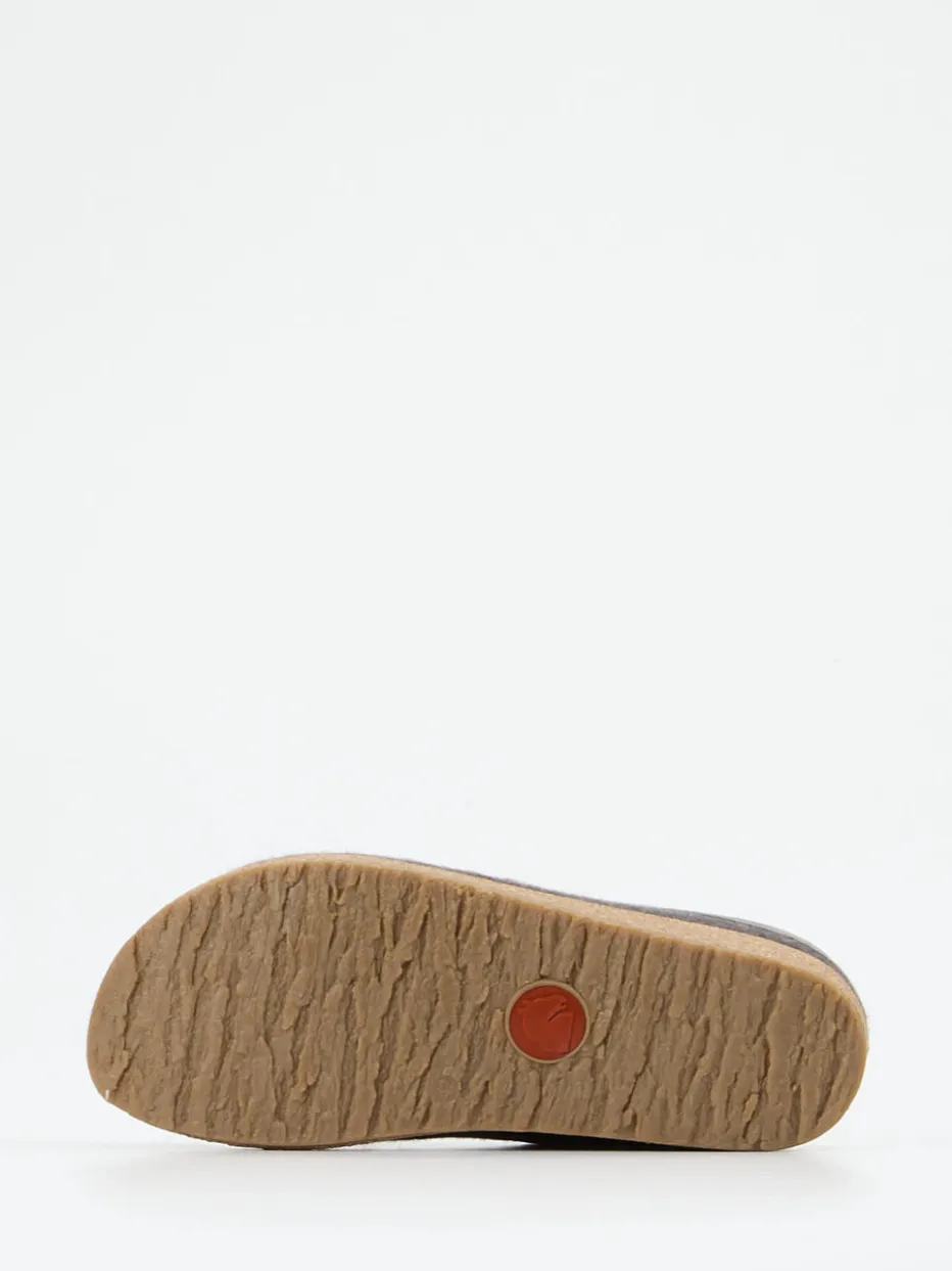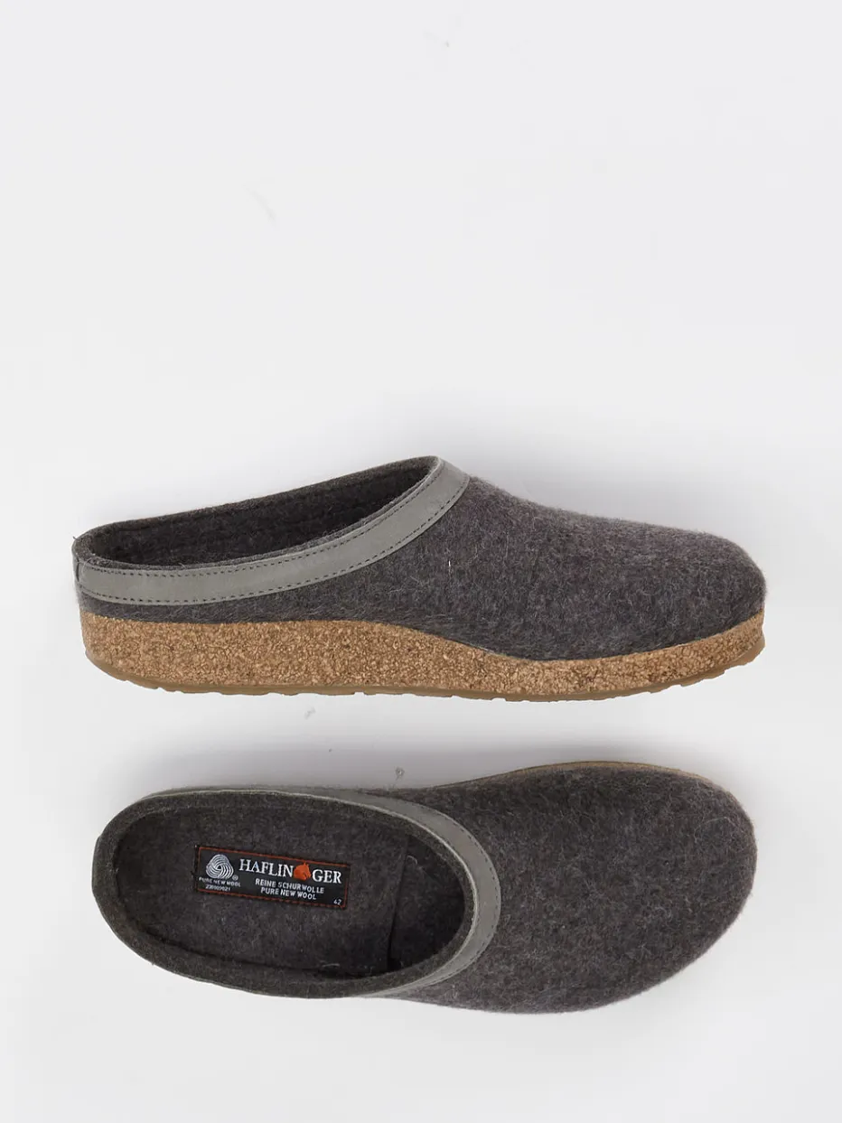 Für entspannte Stunden zu Hause bietet der geschlossene Pantoffel aus reiner, filziger Schurwolle ein warmes, atmungsaktives Tragegefühl. Der offene Fersenbereich in Clog-Silhouette ermöglicht leichtes Hineinschlüpfen. Das ergonomische Korkfußbett und die rutschfeste Gummisohle versprechen Trittsicherheit und Halt. Farblich überzeugt das Modell Ton-in-Ton in Anthrazitgrau mit stilvollem Kunstlederbesatz samt Logoprägung. Inspiriert vom „Slow Living“-Trend passt dazu skandinavische Loungewear ideal.