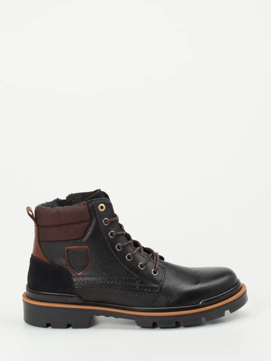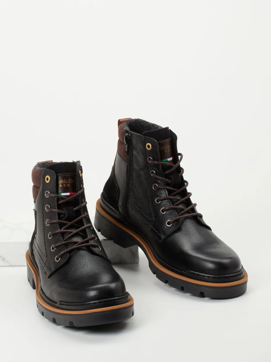 Urbaner Winterschutz für jeden Tag.Pantofola d’Oro interpretiert klassische Herren-Schnürboots in schwarzem Kalbleder, ergänzt um Wildleder-Elemente mit genarbter Oberfläche und cognacfarbene Akzente. Für raue Wetterbedingungen und lange Wege bietet das Modell ein wärmendes Textilfutter, eine robuste Gummisohle mit tiefem Profil sowie eine komfortable Einstiegskombination aus Schnürung und Reißverschluss. Die knöchelhohe Form, goldfarbene Ösen sowie zweifarbige Laufsohle verleihen dem Design markanten Utility-Charakter. Workwear-Ästhetik trifft auf modernen Outdoor-Look. Markentypische Details wie das Logo-Patch runden das Gesamtbild authentisch ab – perfekt für Freizeit-Outfits mit wetterfester Jacke und Thermojeans. Hochwertige Materialien und funktionales Design in typischer Pantofola d’Oro-Qualität.