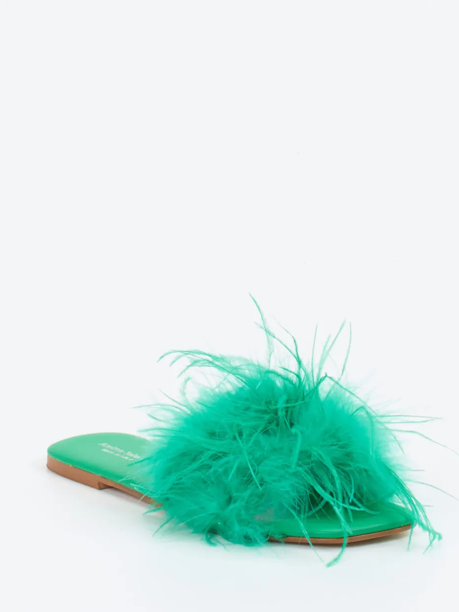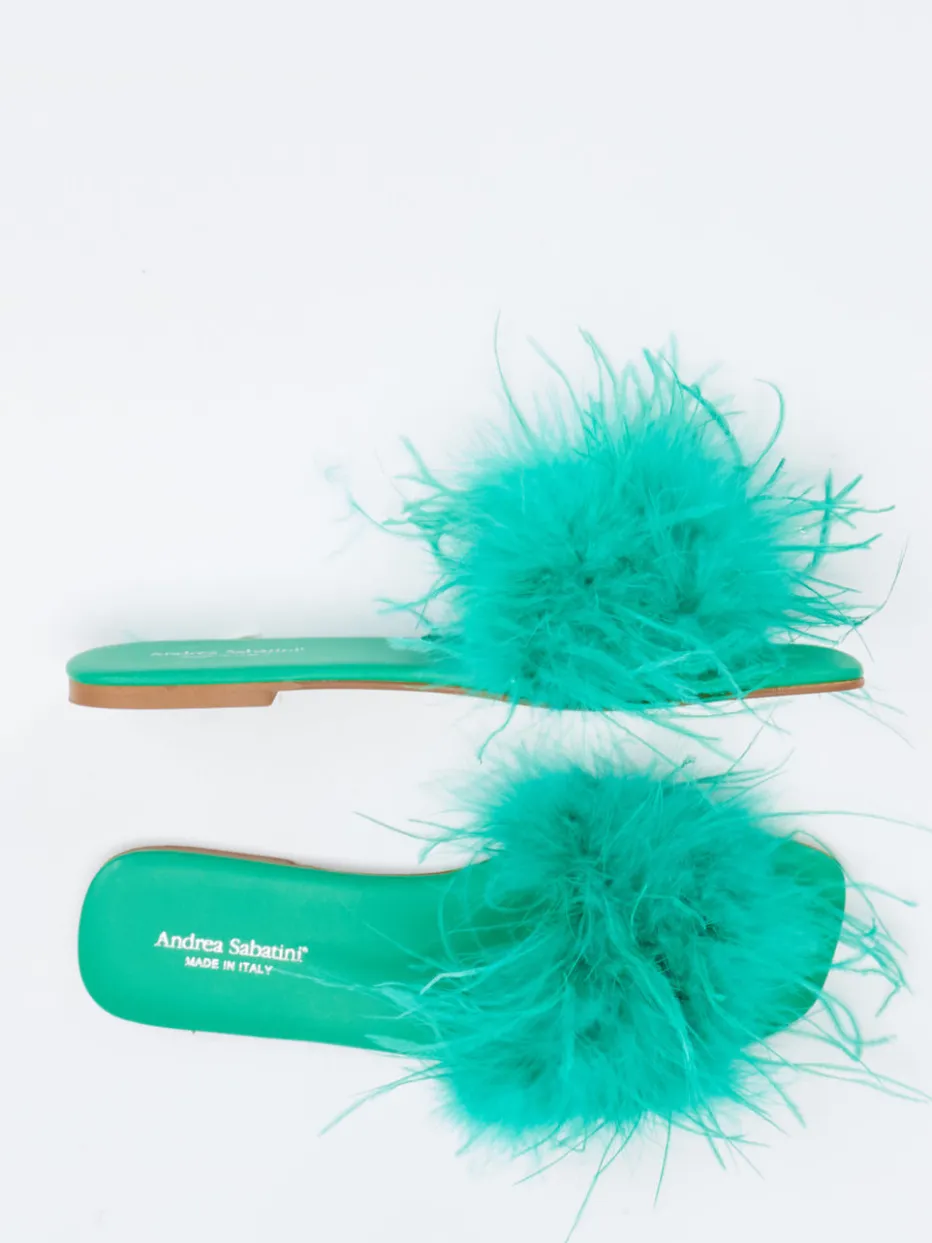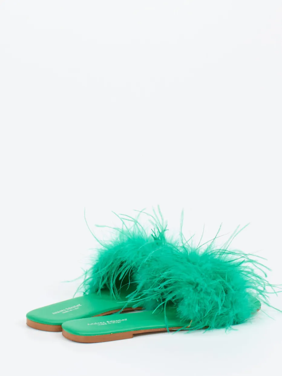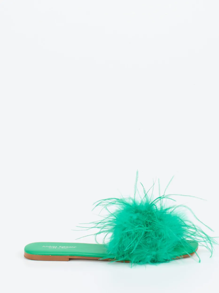 Glamour trifft Loungewear.Die Marke Andrea Sabatini interpretiert die Damen-Pantolette neu: extravaganter Look mit glatter Kunststoffsohle und femininer Leistenform. Ein leuchtend smaragdgrüner Farbton und ein auffälliger Federbesatz verleihen diesem Schuh maximale Ausdruckskraft für sommerliche Events oder stilvolle Relax-Outfits. Das Obermaterial aus Fell, kombiniert mit dekorativen, voluminösen Federn, erzeugt eine matte, flauschige Oberfläche. Die offene Silhouette und flache Laufsohle sorgen für komfortables Hineinschlüpfen. Inspiriert von „Feather Details SS24“ und Vintage-Glam, passt sie hervorragend zu Seidenkimonos oder Mini-Bags in Metallic. Hochwertiges Leder an der Decksohle ergänzt den Luxusfaktor dieser markanten Fashion-Pantolette.