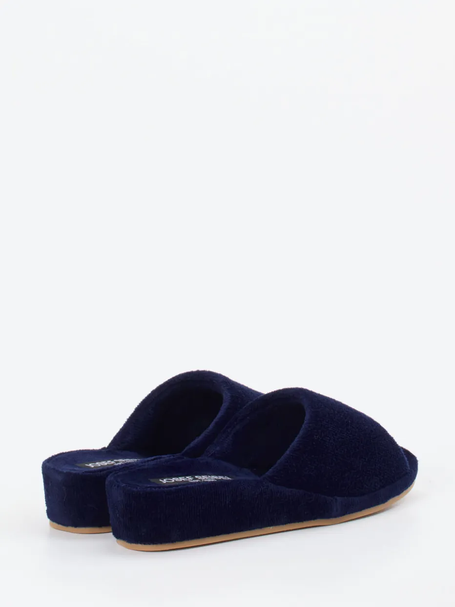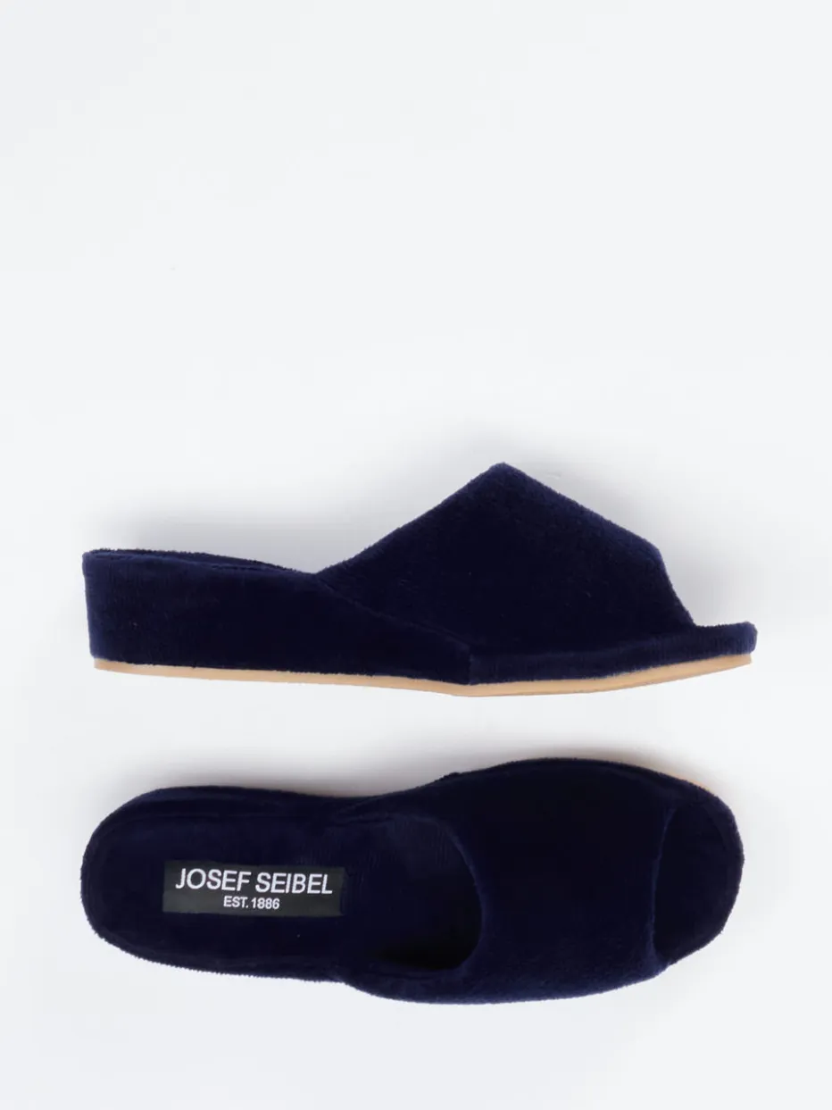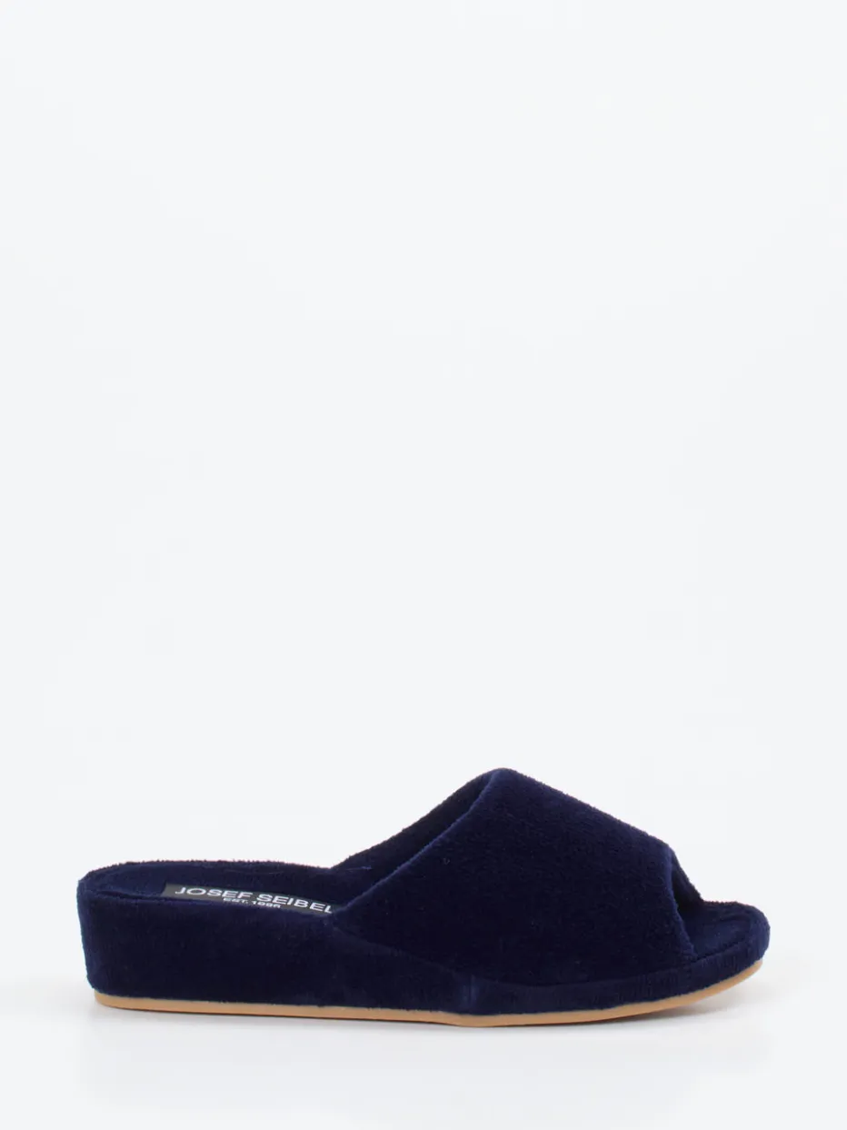 Wohlfühlkomfort für Zuhause.Josef Seibel Relax präsentiert mit dieser Damenpantolette eine stilvolle Ergänzung der Homewear-Garderobe. Ideal für ruhige Momente am Abend oder gemütliche Tage im Homeoffice: Das besonders weiche Textilmaterial in Frottee-Qualität sorgt für ein angenehmes Tragegefühl. Das Ton-in-Ton-Dunkelblau verleiht der klassischen, offen gestalteten Silhouette eine zeitlose Optik. Der leichte Keilabsatz mit Gummisohle bietet stabilen Halt und unterstützt den natürlichen Laufkomfort. Die offene Zehenpartie und das dezent sichtbare Label im Innenschuh unterstreichen den minimalistischen Loungewear-Charakter. Kombiniert mit einem Hausanzug entsteht ein stilvolles Relax-Outfit. Spürbar entspannter Tragekomfort in markentypischer Qualität.