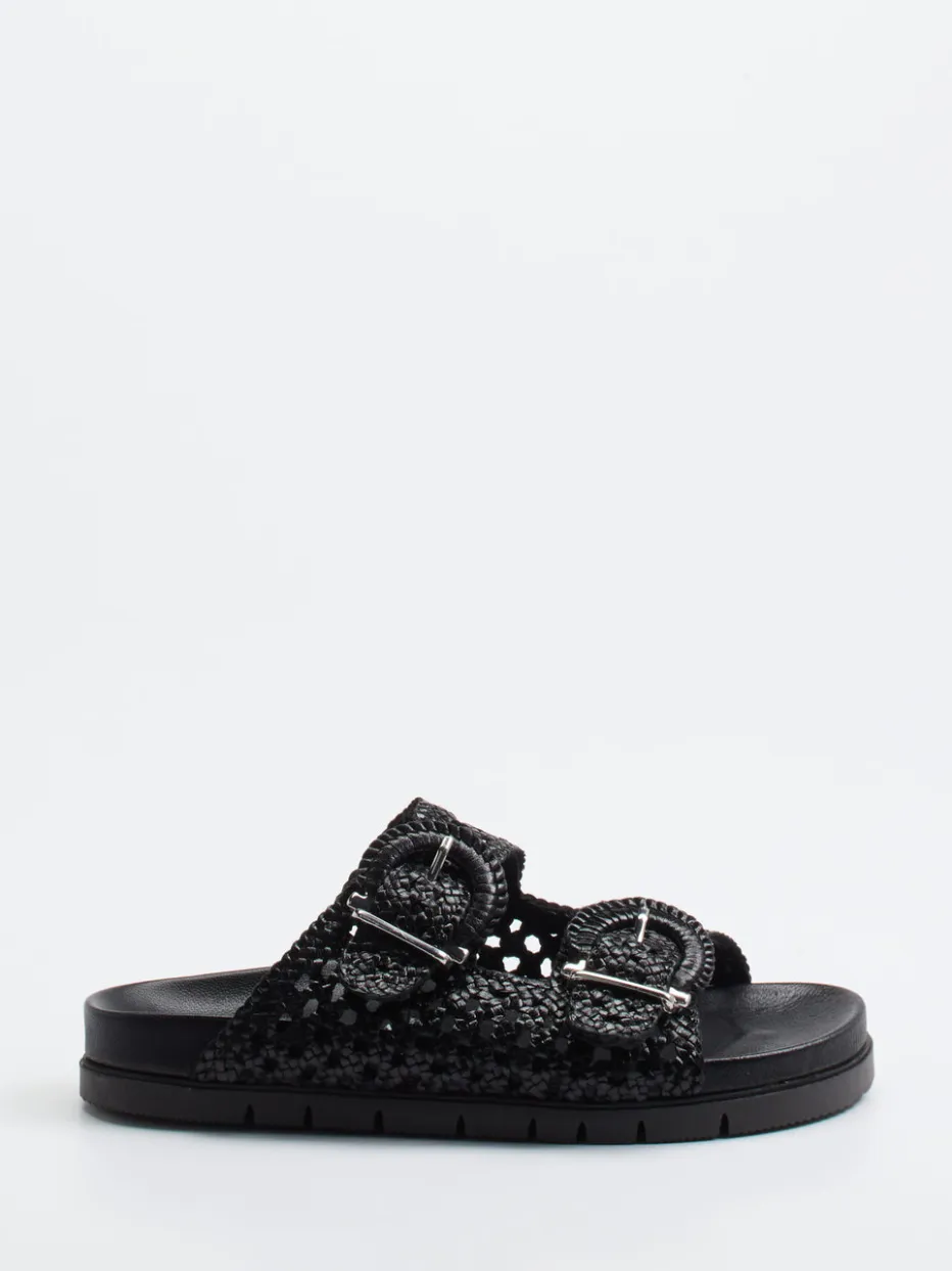 Handgeflochtene Textur und elegante Schnallen in Silberoptik verleihen dieser Pantolette von Pons Quintana eine moderne Leichtigkeit mit hohem Komfortanspruch.