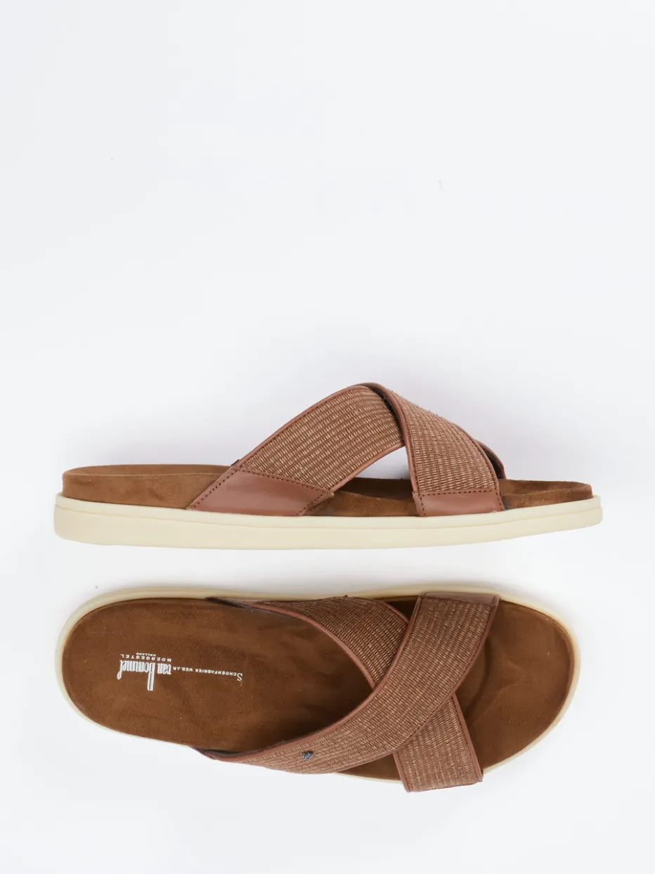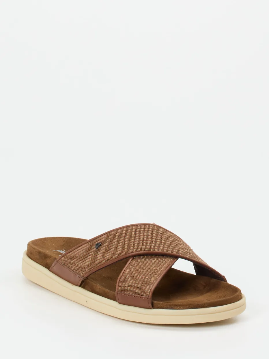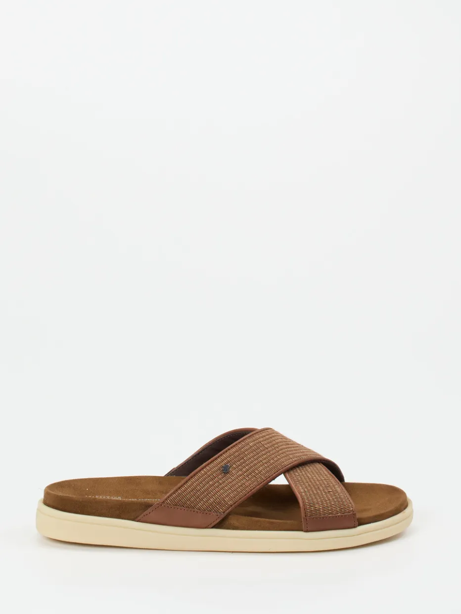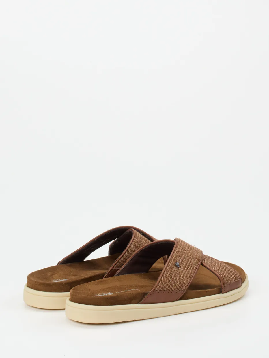 Natürlich minimalistisch gedacht.Die Herren-Pantolette von Floris van Bommel bringt Casual-Komfort auf den Punkt. Ihre gekreuzten Riemen aus geprägtem Kalbleder mit tonigem Textilgeflecht bieten eine taktil interessante Oberfläche und harmonieren farblich mit dem Mittel- bis Rostbraun der Silhouette. Das samtige Veloursleder-Fußbett sorgt für angenehmes Gehen, unterstützt durch die ergonomische Form und die rutschhemmende Gummisohle in Vanillebeige. Durch ihr luftiges Schlupfdesign und die dezente Logo-Plakette erfüllt die Pantolette die Ansprüche moderner „Quiet Luxury“-Ästhetik. Ideal für stilbewusste Freizeit- oder Urlaubslooks – besonders gut tragbar zu Leinen oder Naturtönen. Floris van Bommel steht hier für legeren Chic mit kompromisslosem Komfortanspruch.