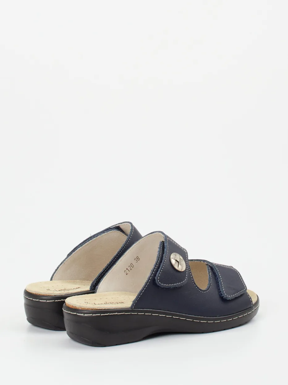 Sommerlicher Komfort, reduziert aufs Wesentliche.Die Damen-Pantolette von Hickersberger ist als echtes Wohlfühlmodell für den Alltag konzipiert. Ein gepolstertes, lederbezogenes Kräuterfußbett sorgt zusammen mit der shockabsorbierenden Keilsohle für spürbaren Gehkomfort – ideal für entspannte Tage. Dunkelblaues Kalbleder mit matter Oberfläche und Kontrastnähten prägt das puristische Design. Die verstellbaren Klettverschlüsse ermöglichen eine individuelle Passform, während die rutschhemmende PU-Sohle sicheren Halt bietet. Inspiriert vom Komfortschuh-Design der Saison SS24 passt die Pantolette zur freizeitorientierten Garderobe – ob zum luftigen Leinenkleid oder zur bequemen Relaxhose. Natürlich funktional mit ergonomisch durchdachten Details – typisch Hickersberger.