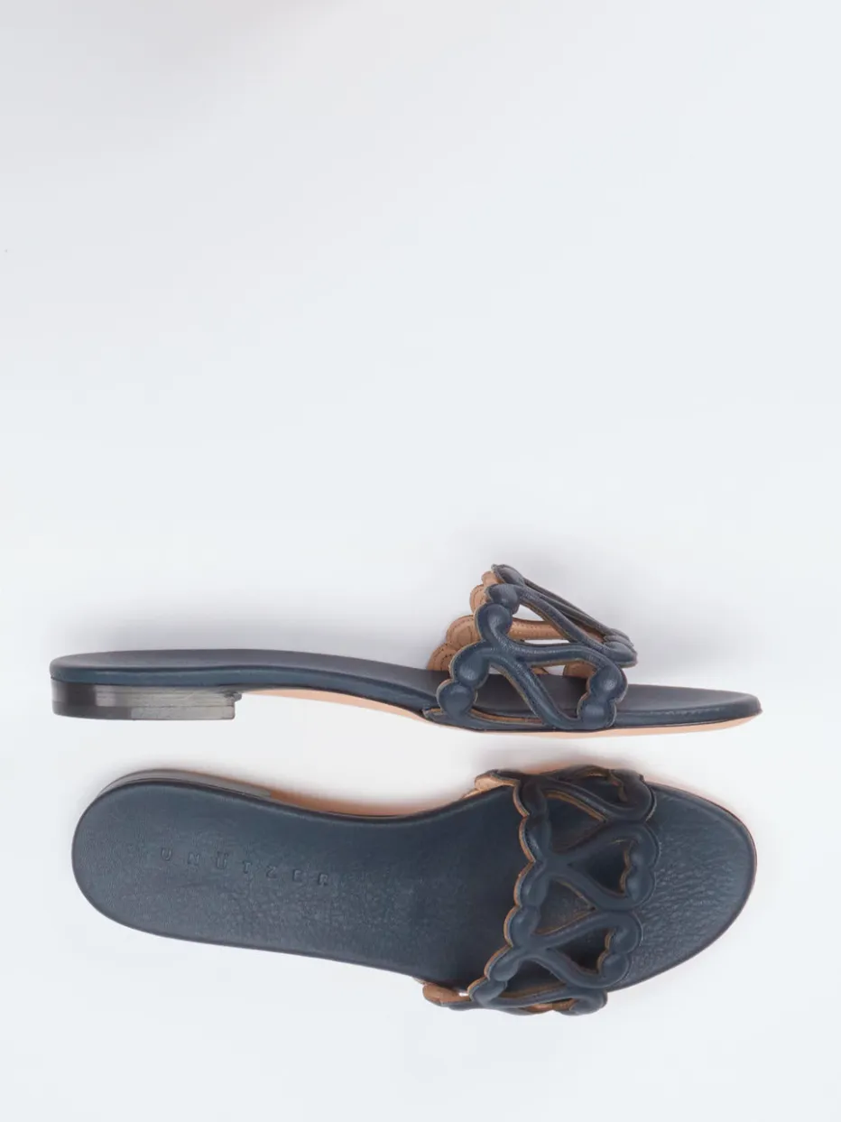 Italienischer Minimalismus für warme Tage.Die Marke Unützer präsentiert mit dieser Damen-Pantolette ein sommerliches Statement in eleganter Schlichtheit. Die flache Slide ist aus hochwertigem, dunkelblauem Kalbleder gefertigt, dessen samtig-matte Oberfläche edel wirkt. Der kunstvoll geformte Lyra-Riemen mit dekorativen Cut-Outs setzt am Spann stilvolle Akzente. Ohne Verschluss konzipiert, überzeugt das Modell durch unaufgeregte Ästhetik und einen angenehm leichten Auftritt – perfekt für Freizeit, Urlaub und Strand. Der mediterrane Chic wird durch die vollständig lederbezogene Sohle handwerklich vollendet. Kombiniert zu leichten Leinenkleidern verströmt sie entspannte Eleganz. Unützer steht für handveredeltes Design made in Italien mit zeitloser Aussage.