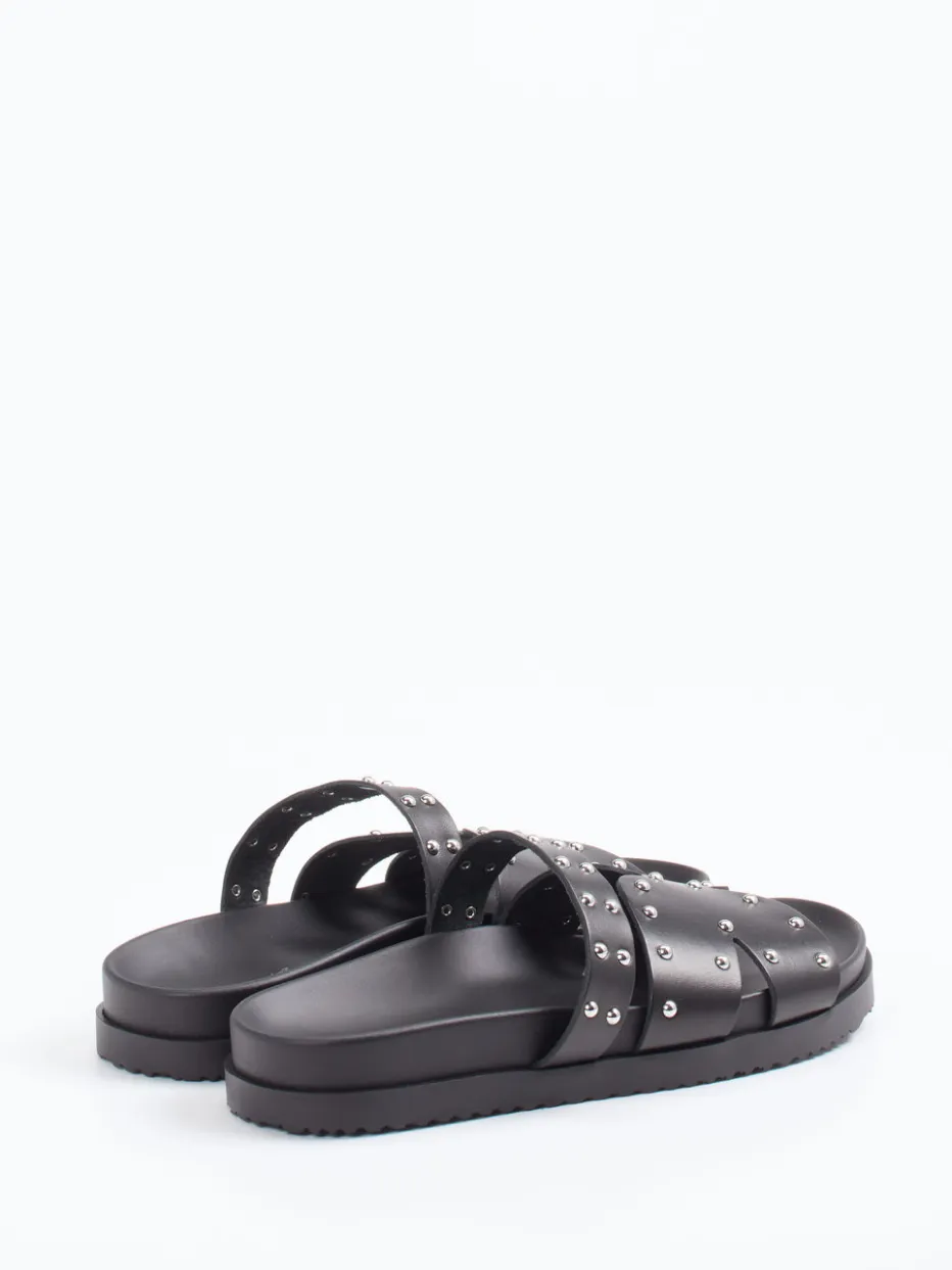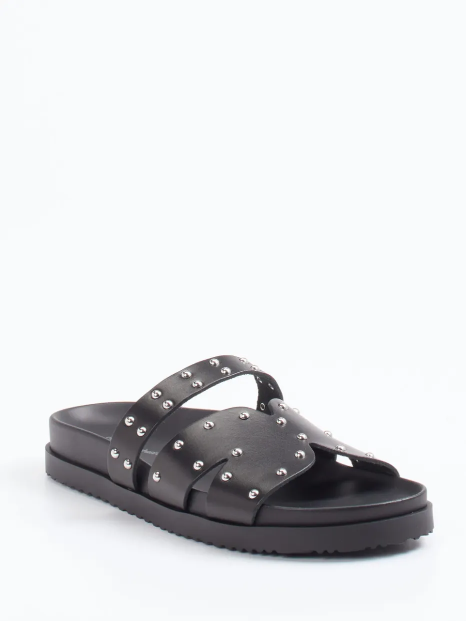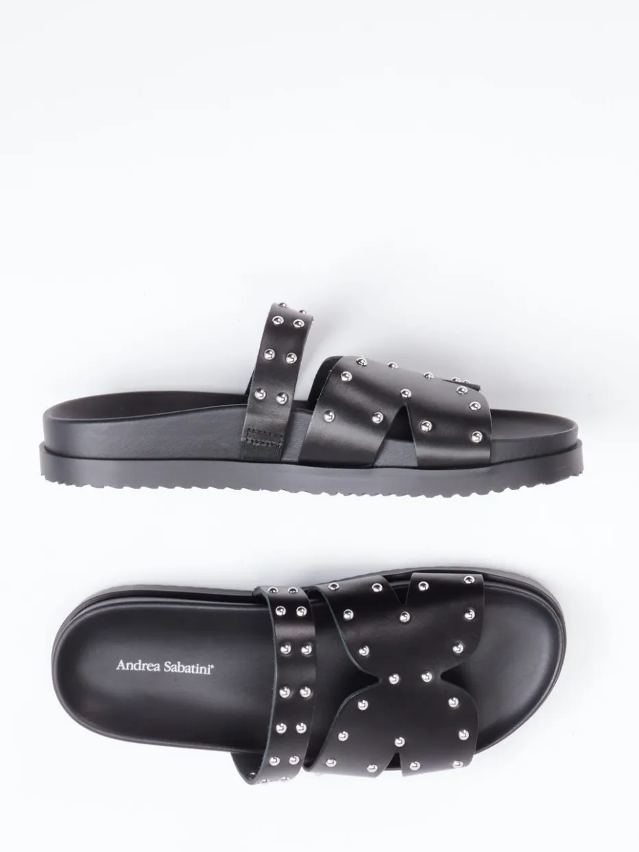 Die Pantolette von Andrea Sabatini vereint mattschwarzes Kalbleder mit silberfarbenen Rundnieten – ein stilvoller Akzent für trendbewusste Sommerlooks.