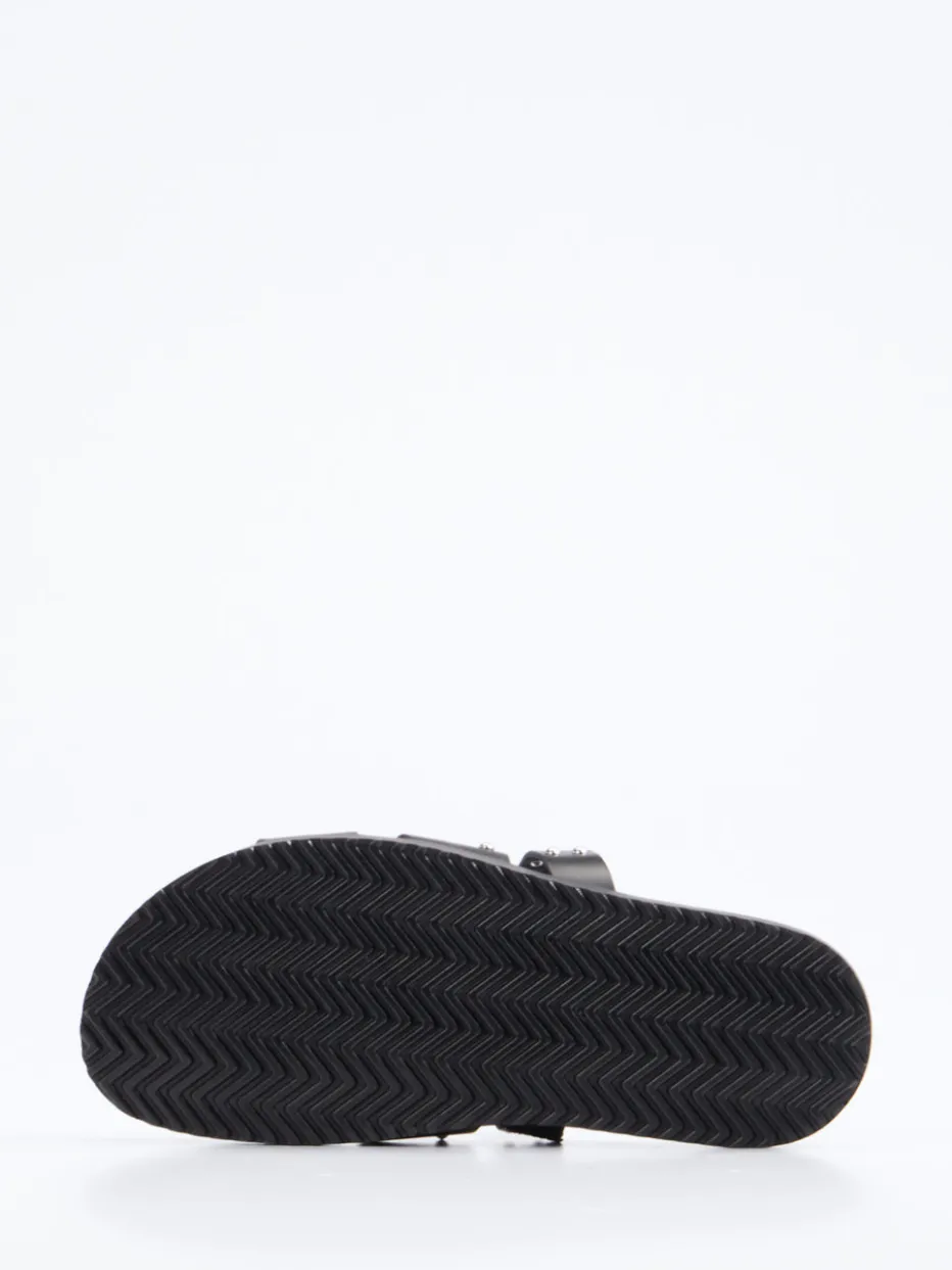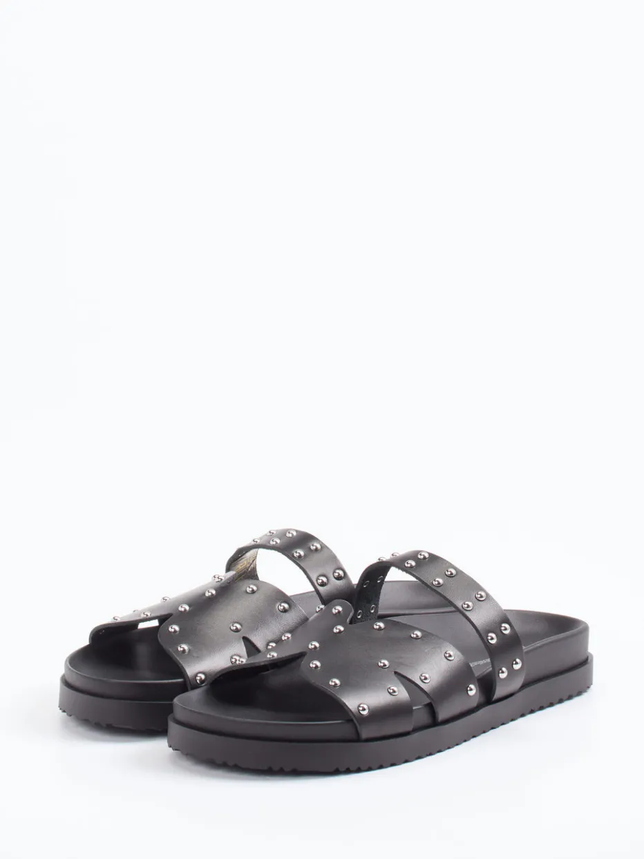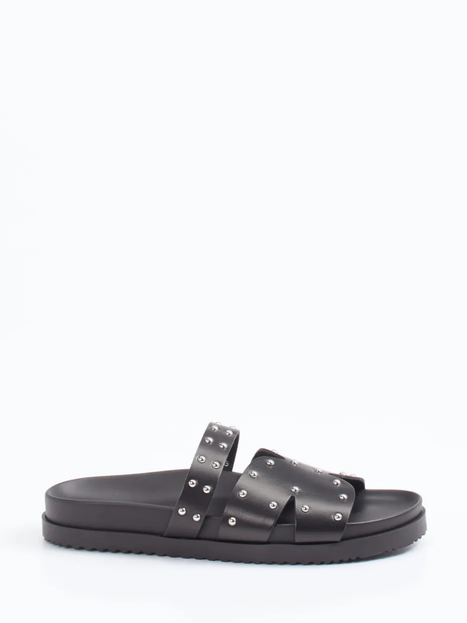 Die Pantolette von Andrea Sabatini vereint mattschwarzes Kalbleder mit silberfarbenen Rundnieten – ein stilvoller Akzent für trendbewusste Sommerlooks.