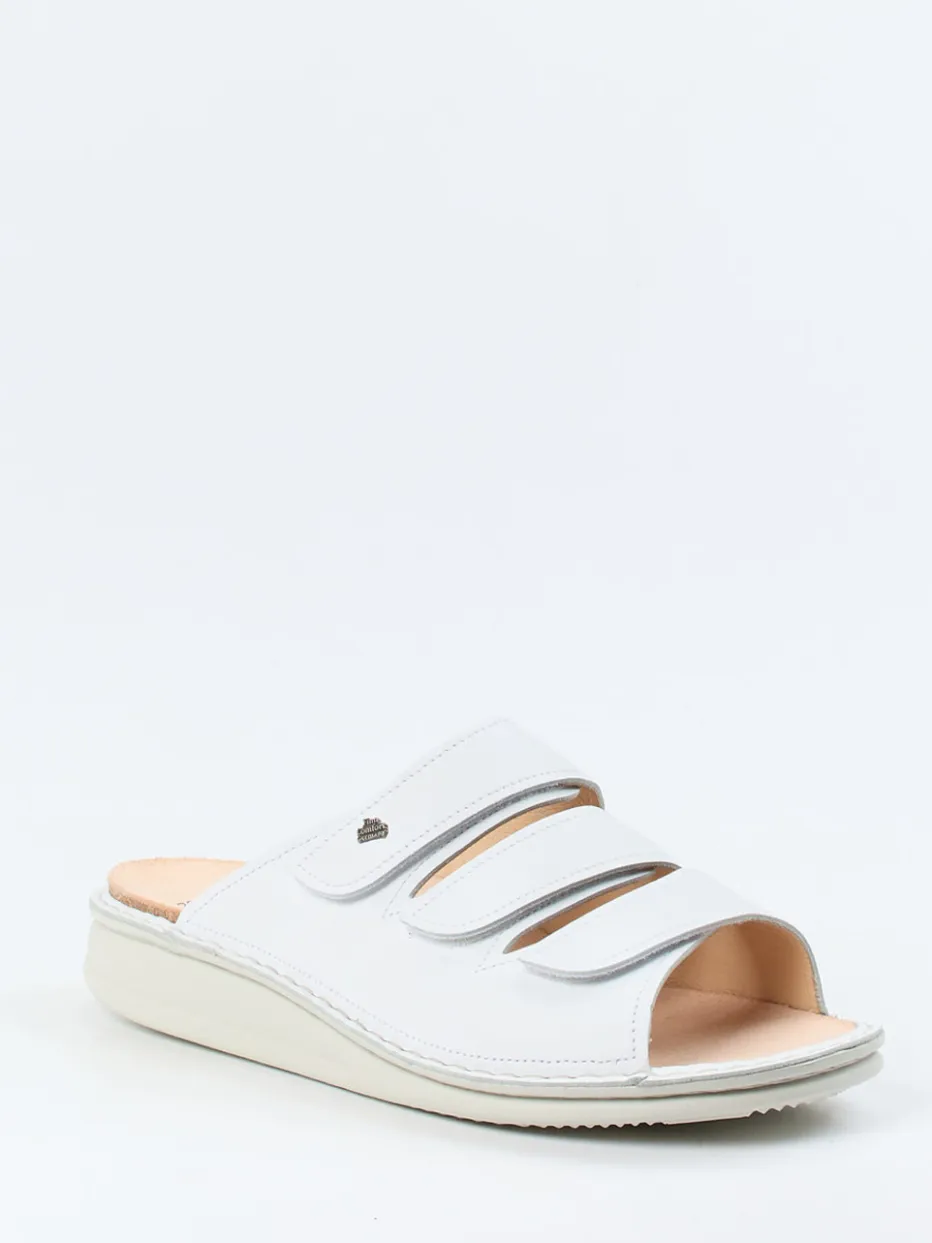 Stilvoll durch entspannte Momente. Finn Comfort präsentiert mit dieser klassischen Damen-Pantolette ein Modell, das Komfort und Funktion harmonisch verbindet. Ob im Alltag oder zuhause – das weiche, weiße Kalbleder sorgt zusammen mit der gepolsterten Lederdecksohle für ein angenehmes Tragegefühl. Drei Klettverschlüsse ermöglichen eine individuelle Anpassung, während das herausnehmbare, lederbezogene Korkfußbett auch für orthopädische Einlagen geeignet ist. Die leichte PU-Sohle mit Keilabsatz verleiht Trittsicherheit und unterstreicht die gesundheitsorientierte Silhouette. Silberfarbene Logodetails und kontrastierende Nähte setzen dezente Akzente im minimalistisch inspirierten Design. Perfekt kombinierbar zu luftiger Homewear oder klassischer Sommerkleidung. Ein funktional durchdachtes Modell für anspruchsvolle Komfortliebhaberinnen.