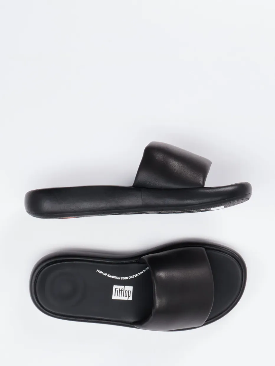 Reduktion als Stilprinzip.Die Marke FitFlop präsentiert mit dieser schwarzen Pantolette eine stilvolle Wahl für Alltag, Reise oder entspannte Stunden zu Hause. Die offene Slides-Silhouette kombiniert weiches Kalbleder mit einer samtig-matten Oberfläche und ergonomischem Fußbett. Der voluminöse, gepolsterte Riemen sorgt für optimalen Sitz, während die abriebfeste Gummisohle sicheren Halt bietet. Ohne Verschluss gestaltet, spiegelt das Modell den Streetwear-inspirierten „Quiet Luxury“-Trend wider und passt ideal zu minimalistischen Sommer-Outfits. Besonders harmonisch wirkt der Look zu leichten Shorts und Oversized-Shirts. Komfort und Understatement – FitFlop definiert entspannte Eleganz auf neuem Niveau.