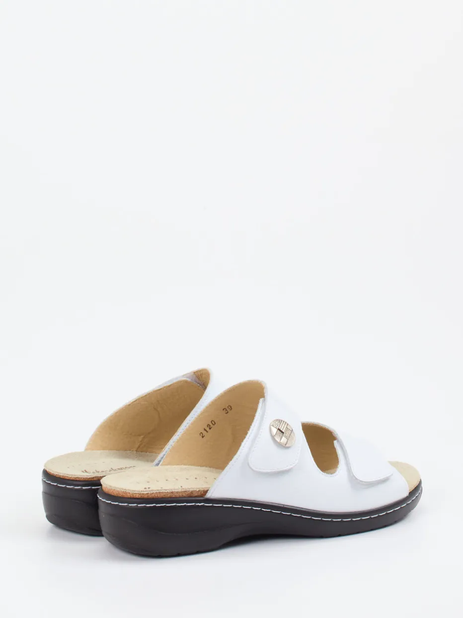 Ergonomie trifft auf Natürlichkeit.Die Hickersberger Komfort-Pantolette wurde speziell für einen entspannten Alltag entwickelt. Ob beim Frühstück auf der Terrasse oder beim gemütlichen Nachmittagsspaziergang – diese Pantolette bietet dank anatomisch geformtem, lederbezogenem Kräuterfußbett in Weite G optimalen Komfort. Weißes Kalbleder mit matter Oberfläche unterstreicht zusammen mit silberfarbenem Zierknopf und Kontrastnähten das dezente Design. Zwei verstellbare Klettverschlüsse sorgen für individuelle Passform, während die PU-Sohle mit integrierter Schockabsorption und rutschhemmendem Profil stabilen Halt bietet. Inspiriert vom „Health Aesthetics“-Trend passt sie perfekt zu relaxten Freizeit-Looks. Alltagstauglicher Komfort mit gesundheitsorientiertem Anspruch – typisch Hickersberger.