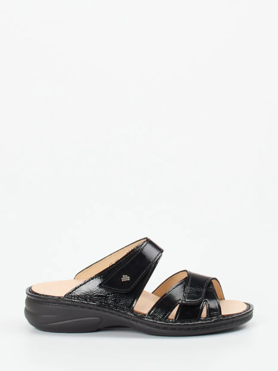 Diese Pantolette von Finn Comfort kombiniert glänzendes Lackleder mit ergonomischer Passform und justierbaren Klettverschlüssen für funktionalen Komfort im Alltag.