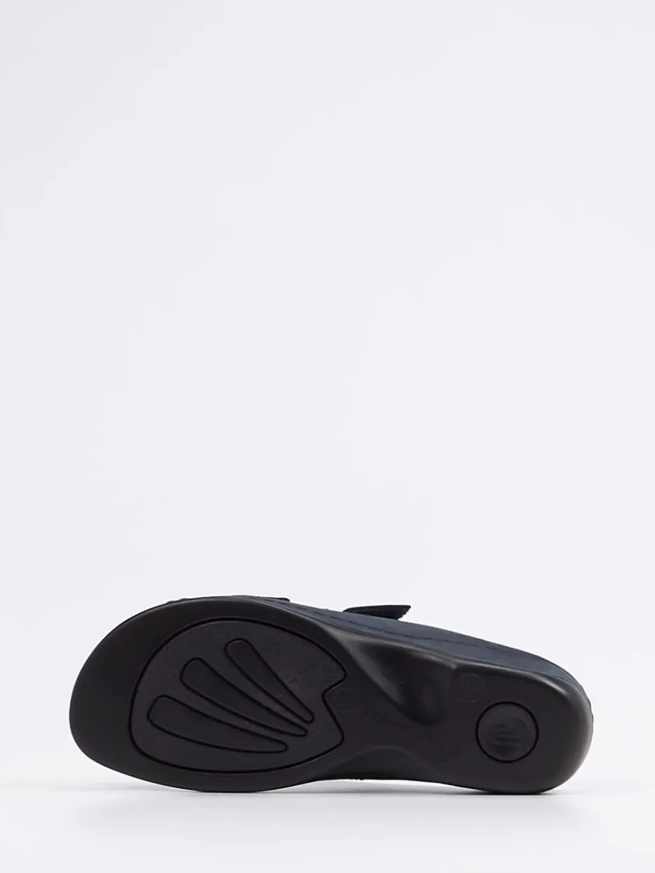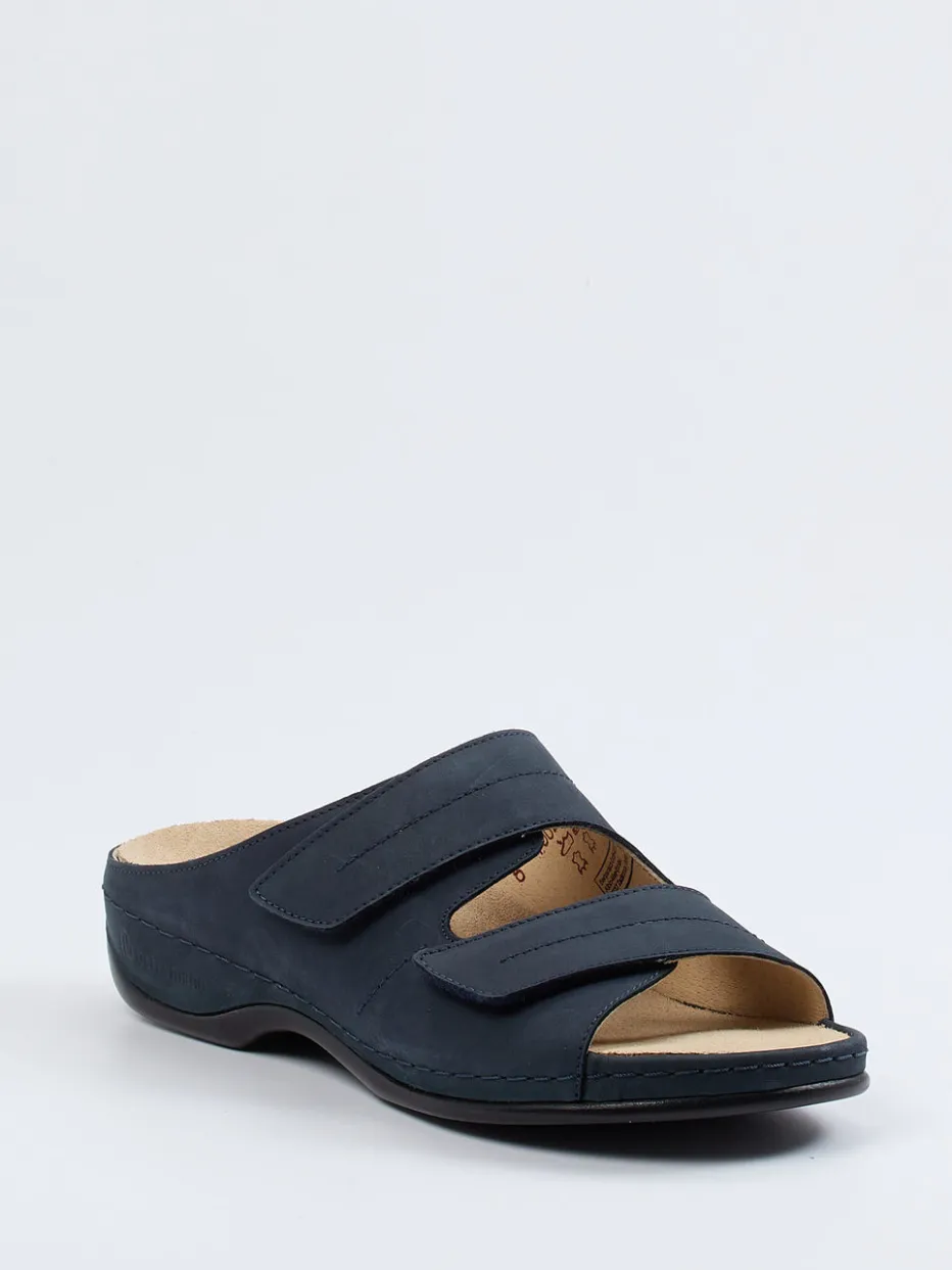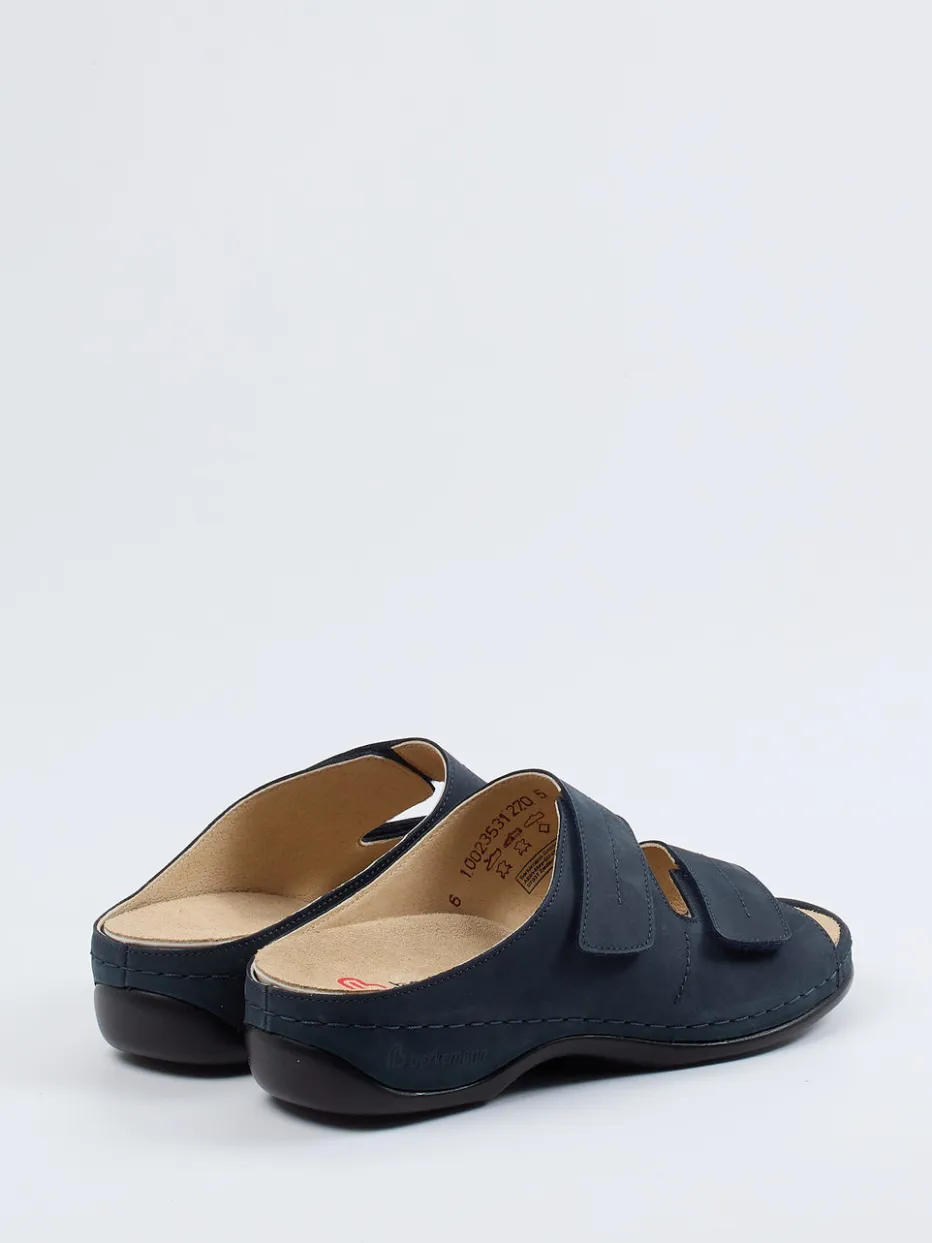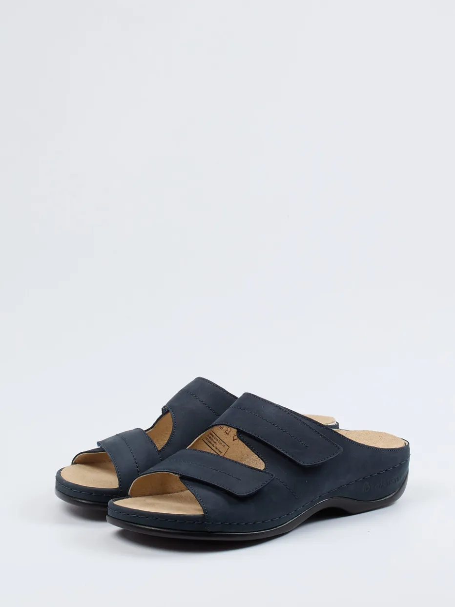 Viel Komfort für den Alltag.Die Damen-Pantolette von Berkemann bietet in Form und Funktion, was bequeme Sommerschuhe auszeichnet. Ob in den eigenen vier Wänden oder für entspannte Stunden draußen – das ergonomisch designte Fußbett sorgt jederzeit für angenehmes Tragen. Hergestellt aus samtig angeschliffenem Nubukleder in edlem Dunkelblau, wirkt das Modell mit seinen Ton-in-Ton-Nähten dezent-sportlich. Zwei Klettverschlüsse ermöglichen eine stufenlose Anpassung, während die hochgezogene, weiße Gummisohle sicheren Halt garantiert. Inspiriert von minimalistischen Komfortdesigns, passt die Silhouette ideal zu casual Outfits. Ein hochwertiger Bequemschuh mit funktionalen Details für kompromisslosen Komfort.