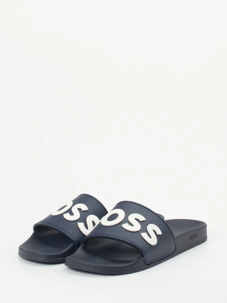 Sommer-Routine neu definiert.Die Pantolette von Boss ist ein funktionaler und stilbewusster Begleiter für Freizeit und Urlaub. Das dunkelblaue Synthetikmaterial mit matter Oberfläche liegt angenehm auf der Haut, während das ergonomisch geformte Fußbett für hohen Tragekomfort sorgt. Der breite Riemen in Schlupfform zeigt ein markantes, weißes Logo, das sich auf der Gummisohle als Prägung fortsetzt – ein Statement im Look von „Quiet Luxury“. Die offene, flache Silhouette unterstreicht die entspannte Ästhetik des Modells. Ideal kombinierbar mit Badeshorts oder Loungewear. Komfort und Logo-Akzent in typischer Boss-Prägnanz.