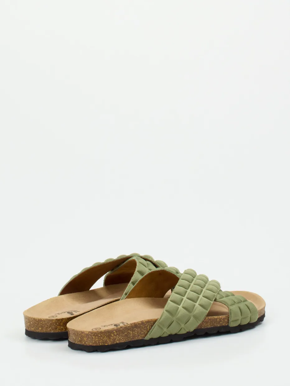 Bequem durch den Sommer.Die Marke Thies zeigt mit dieser Damen-Pantolette ein entspanntes Modell im aktuellen Padded-Look. Ideal für entspannte Tage zuhause oder unterwegs bietet die Pantolette mit soft gepolsterten Riemen aus matt strukturiertem Textil optimalen Komfort. Das ergonomisch geformte Kork-Fußbett überzeugt durch Natürlichkeit und sorgt zusammen mit der weiß profilierten Gummisohle für Trittsicherheit. Visuell setzen gekreuzte Riemen in sanftem Salbeigrün moderne Akzente, die den Natural-Materials-Trend stilvoll aufgreifen. Passt hervorragend zu Leinenhosen oder sommerlichen Strandoutfits. Nachhaltiger Komfort trifft auf entspanntes Design von Thies.