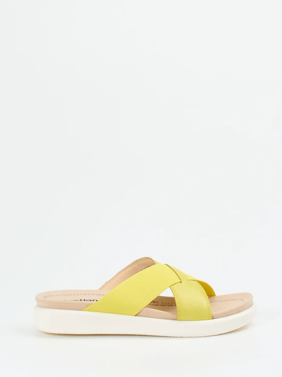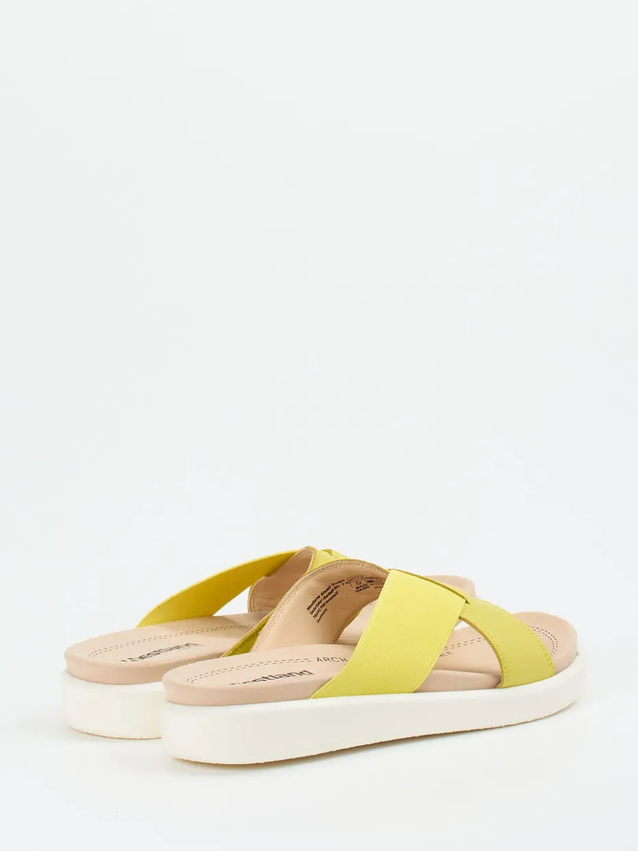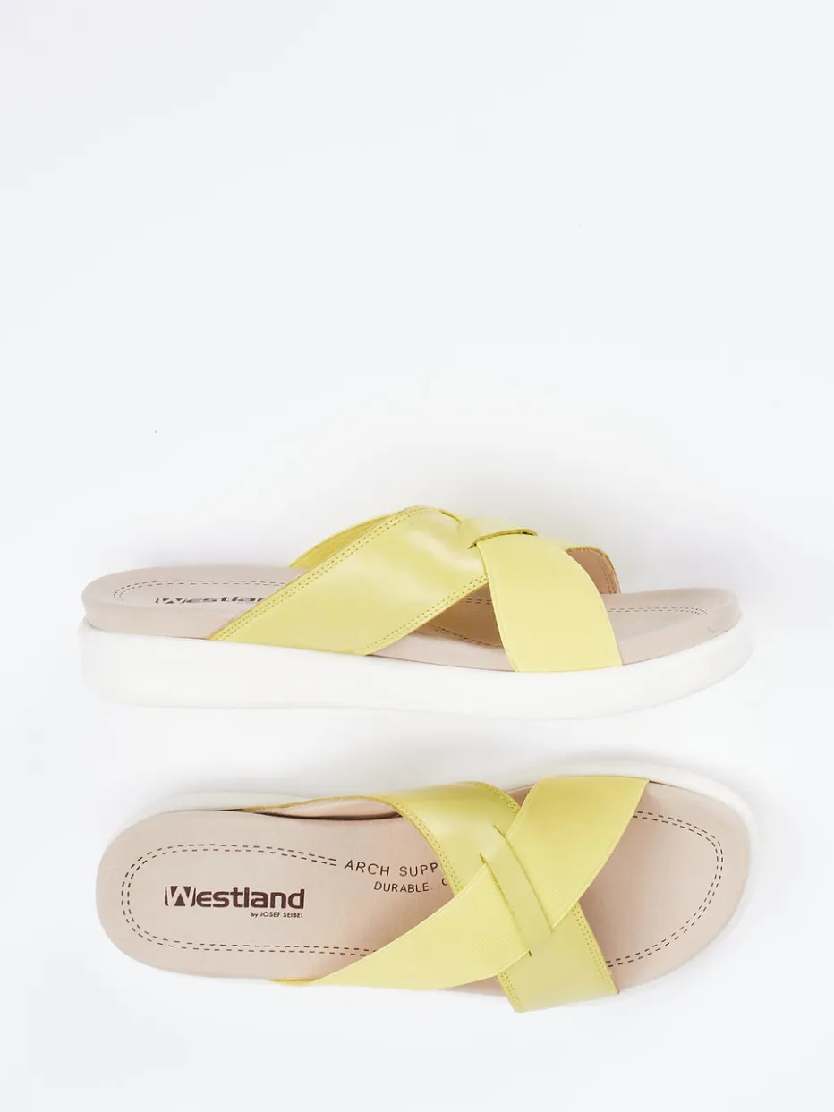 Strahlender Minimalismus für sonnige Tage.Westland interpretiert die klassische Damen-Pantolette als stilvolles Komfort-Modell. Perfekt für entspannte Ausflüge in der Stadt oder am Strand: Diese offene Pantolette kombiniert leuchtend zitronengelbes Kalbleder mit einem elastischen Kreuzriemen für optimalen Sitz. Das gepolsterte Fußbett mit Arch Support und die weiße Gummisohle bieten ein angenehmes Tragegefühl – auch barfuß. Dezente Prägung im Fußbett, rutschfestes Profil und die robuste Verarbeitung unterstreichen den funktionalen Anspruch. Ob zu Leinenhose oder Sommerkleid – ein Highlight für lässige Looks. Westland steht für stilvolle Alltagstauglichkeit mit hohem Komfortniveau.