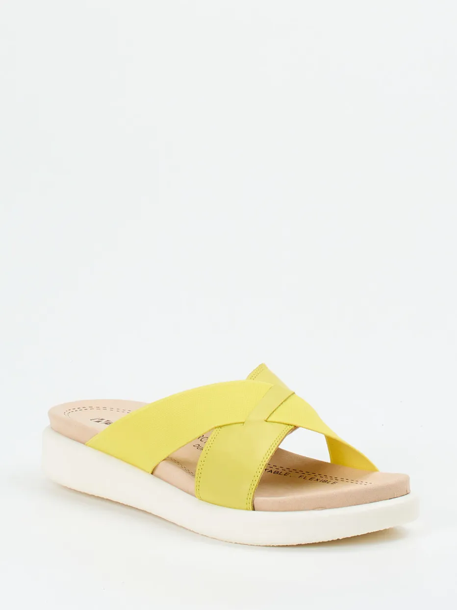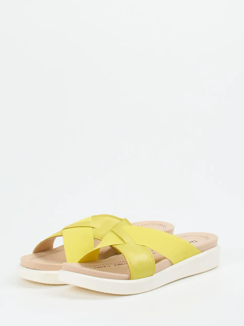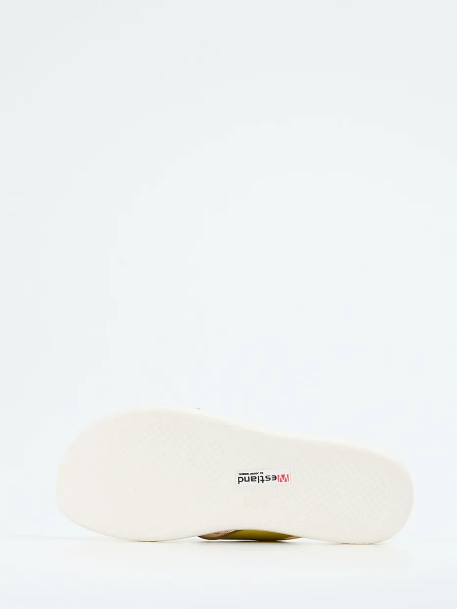 Strahlender Minimalismus für sonnige Tage.Westland interpretiert die klassische Damen-Pantolette als stilvolles Komfort-Modell. Perfekt für entspannte Ausflüge in der Stadt oder am Strand: Diese offene Pantolette kombiniert leuchtend zitronengelbes Kalbleder mit einem elastischen Kreuzriemen für optimalen Sitz. Das gepolsterte Fußbett mit Arch Support und die weiße Gummisohle bieten ein angenehmes Tragegefühl – auch barfuß. Dezente Prägung im Fußbett, rutschfestes Profil und die robuste Verarbeitung unterstreichen den funktionalen Anspruch. Ob zu Leinenhose oder Sommerkleid – ein Highlight für lässige Looks. Westland steht für stilvolle Alltagstauglichkeit mit hohem Komfortniveau.
