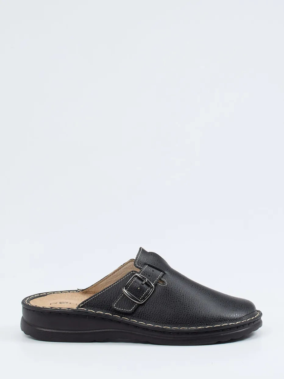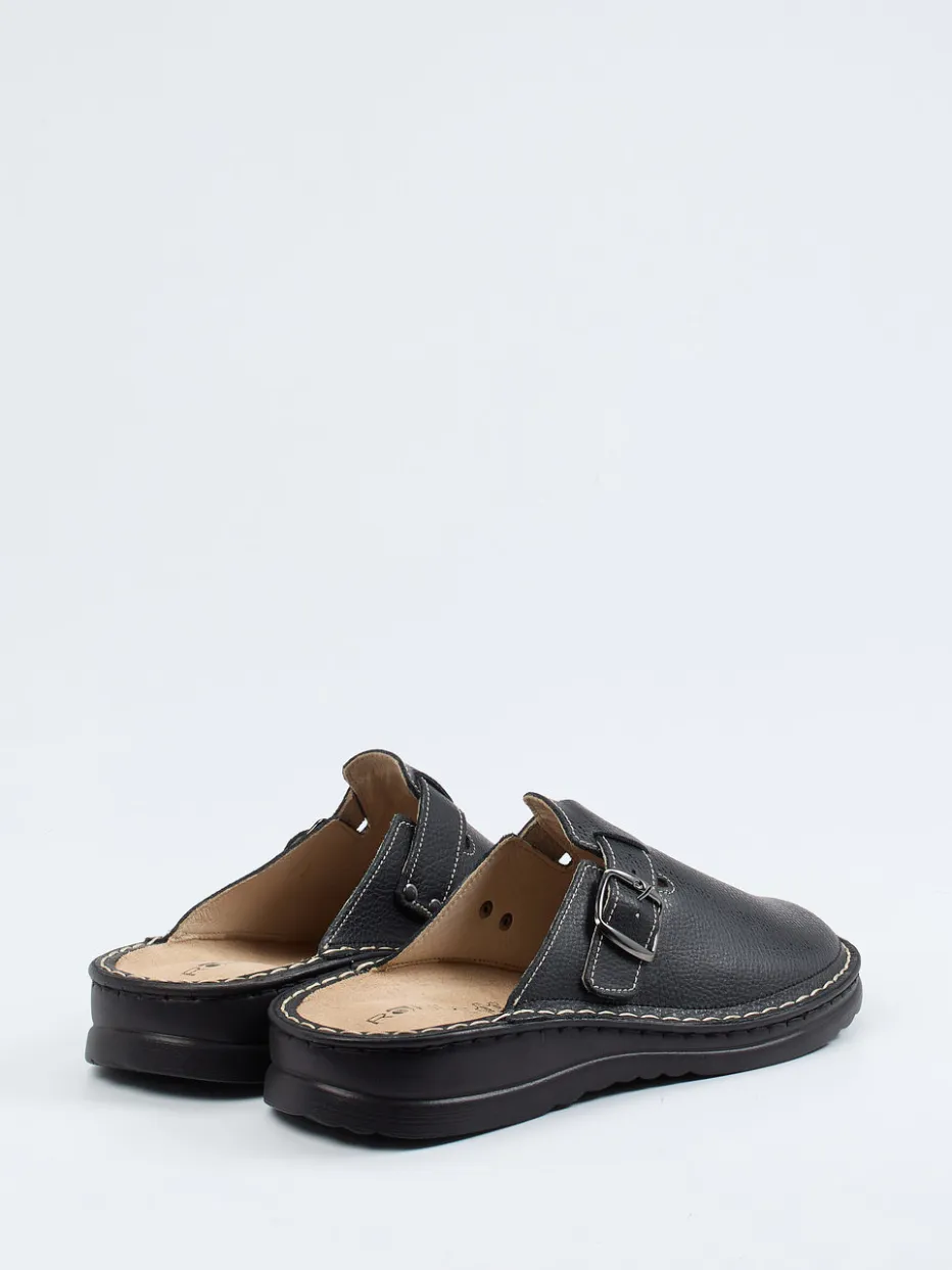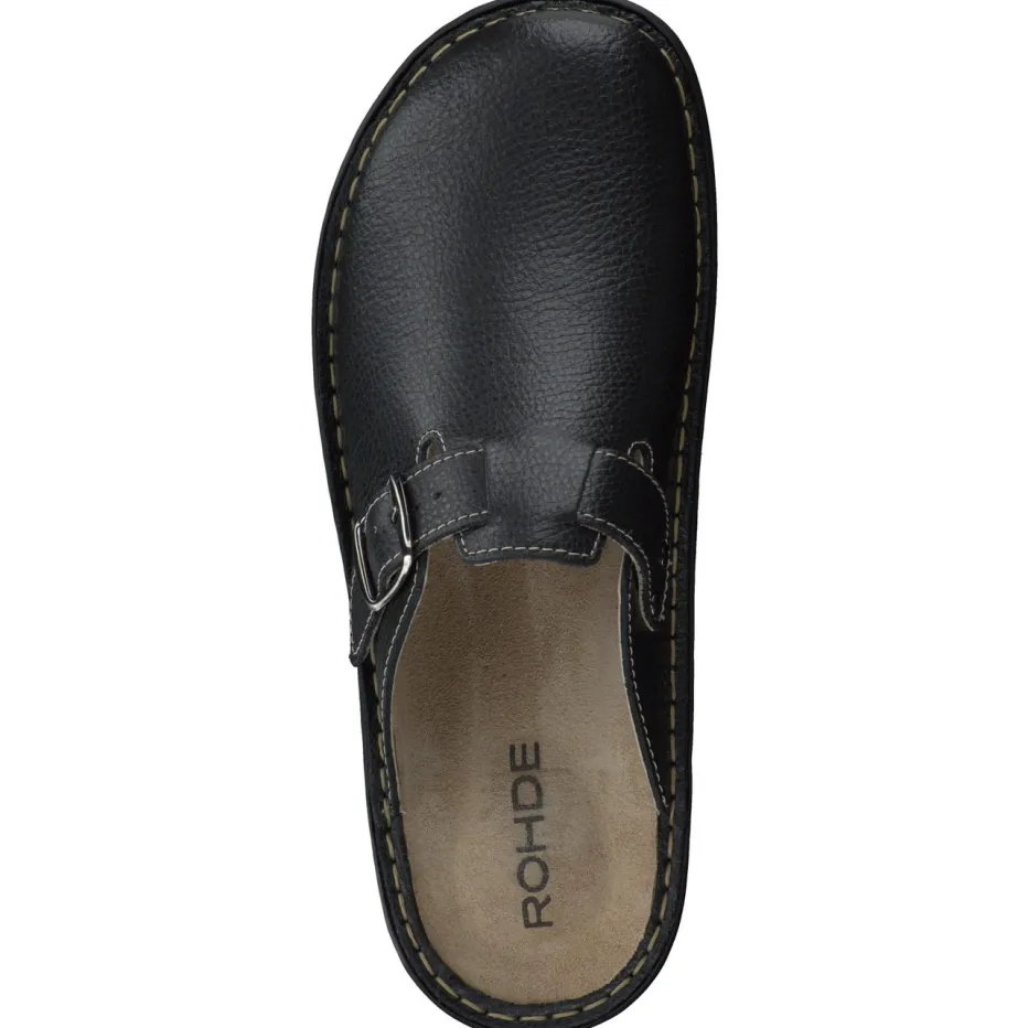 Rohde präsentiert stilvolle Pantoletten für entspannte Momente. Das Modell ist aus schwarzem, grobnarbigem Kalbleder gefertigt und bietet dank weicher Polsterung und verstellbarer Schnalle eine fußfreundliche Passform.