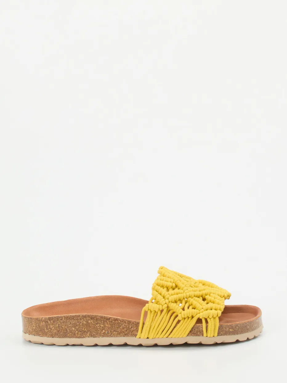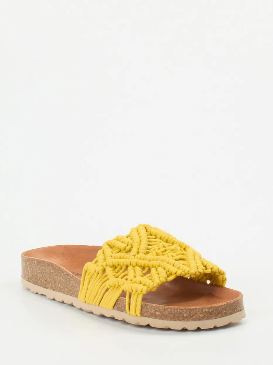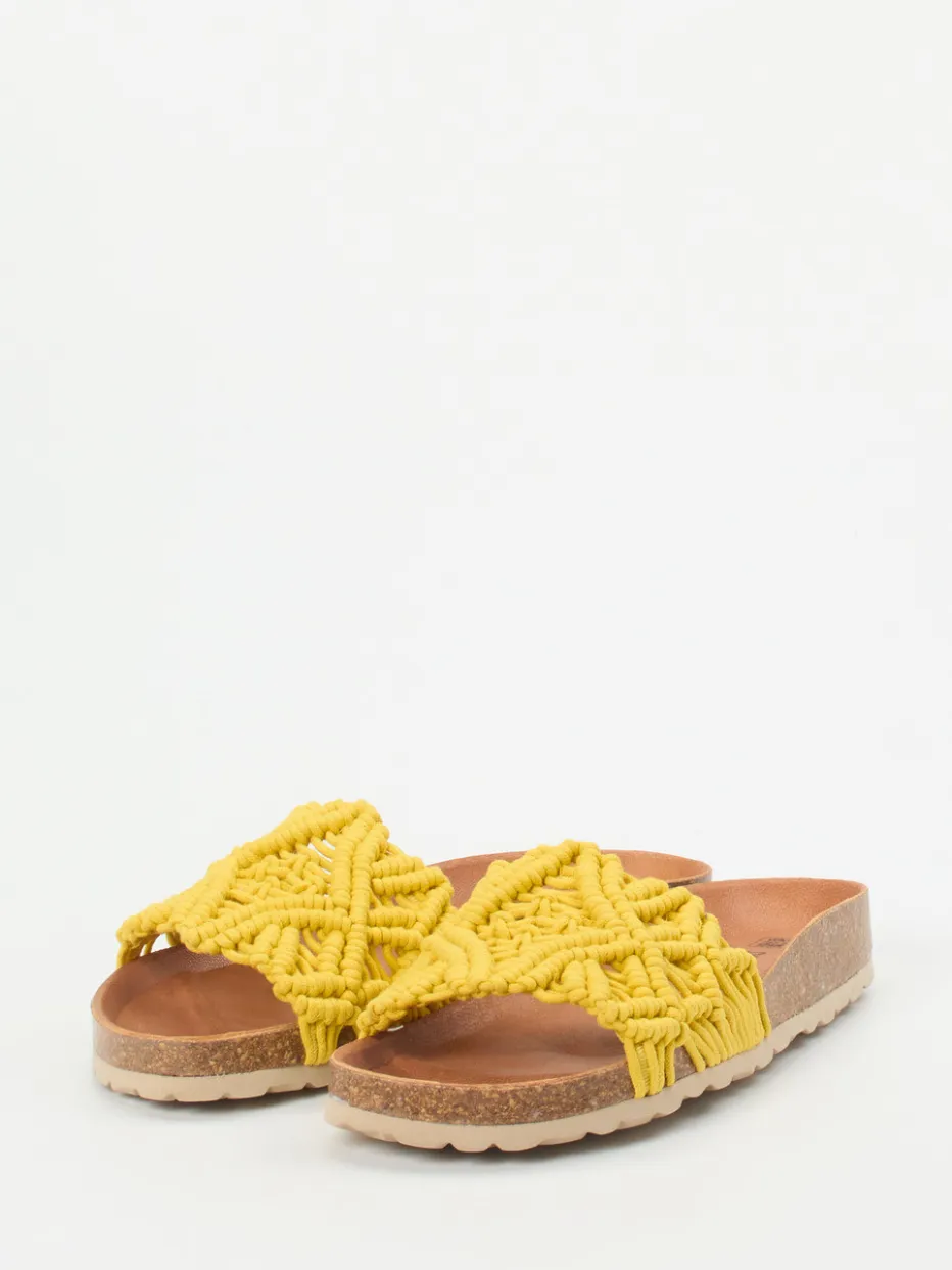 Die handwerklich inspirierte Makramee-Struktur der Pantoletten trifft auf ein ergonomisches Kork-Fußbett – ideal für stilbewusste Sommertage.