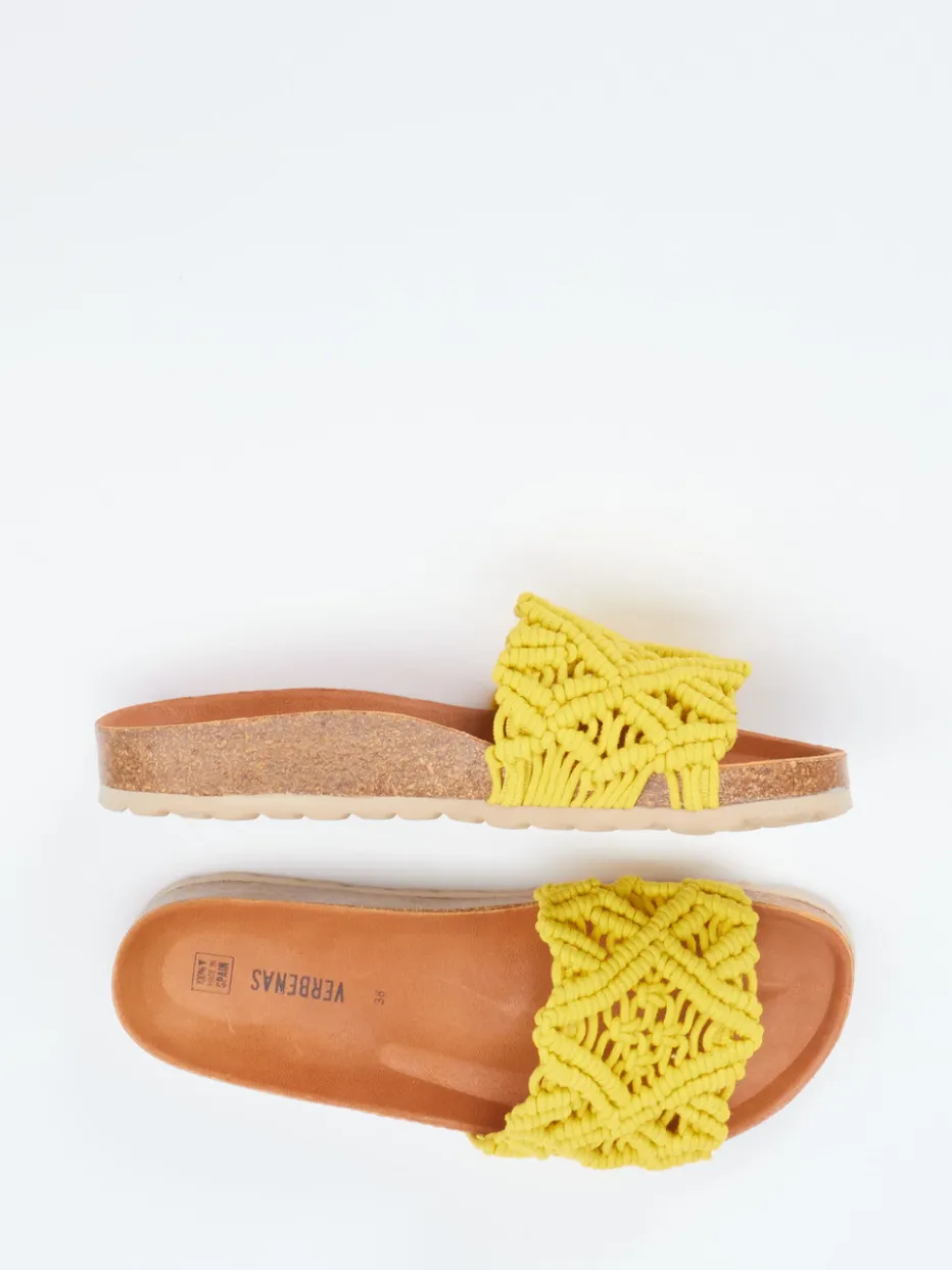 Boho-Vibes für warme Tage.Verbenas präsentiert sommerliche Damen-Pantoletten in handgearbeiteter Optik. Für Urlaub, Stadtspaziergang oder Gartenfest: Diese Pantoletten verbinden ein strukturiertes Textilmaterial in sonnigem Gelb mit einem angenehm geformten Fußbett aus Naturkork. Der Riemen in Makramee-Optik unterstreicht die modische Boho-Note und sorgt für luftigen Tragekomfort. Die profilierte Laufsohle aus Synthetik bietet Trittsicherheit, die flache, offene Silhouette wirkt entspannt und modern. Ideal zur Leinenhose, Strohtasche oder Maxikleid. Verbenas vereint hier Handwerksästhetik und Komfort zu einem leichten Freizeitfavoriten.
