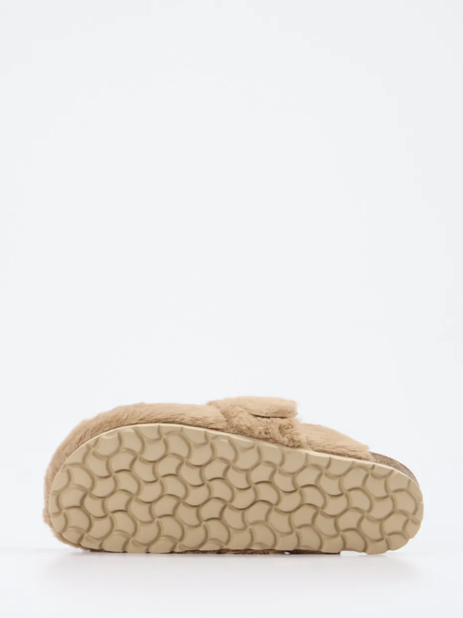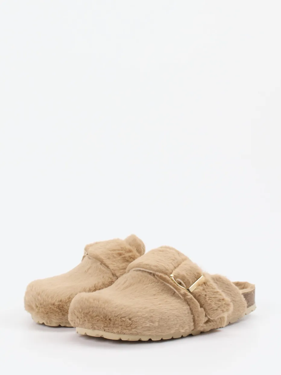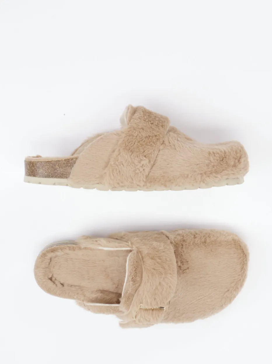 Flauschiges Design für entspannte Stunden.Die Marke Cypres präsentiert mit diesen Damenpantoletten ein stilvolles Modell für gemütliche Tage daheim. Ein weiches Kunstfell-Obermaterial in beigebrauner Farbgebung sorgt für ein behagliches Tragegefühl und zieht mit seiner flauschigen Textur Blicke auf sich. Der goldfarbene Schnallenverschluss verleiht dem geschlossenen Frontdesign einen glamourösen Touch. Die ergonomisch geformte Kork-Zwischensohle mit griffiger Gummilaufsohle garantiert Komfort und Halt – inspiriert vom Cozy Comfort-Trend FW24. Optimal kombinierbar mit feiner Strick-Loungewear oder Kuschelsocken. Cypres liefert hier ein wohldurchdachtes Wohlfühlprodukt mit modernem Lounge-Charakter.