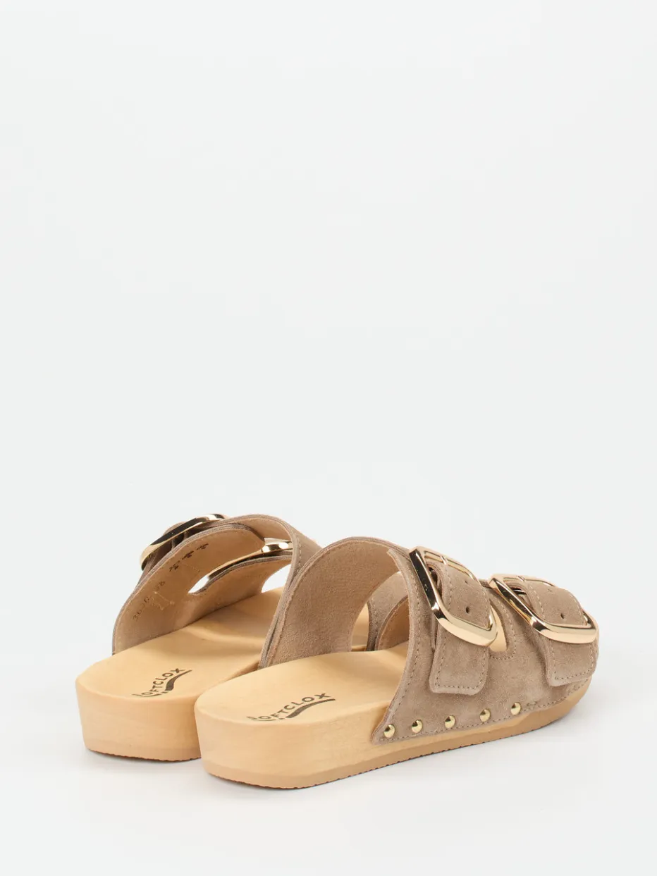 Skandinavische Leichtigkeit trifft Komfort.Die Marke Softclox präsentiert mit dieser Damen-Pantolette ein Design für entspannte Sommertage. Die genietet verarbeitete Holzsohle mit integriertem Elast-Element sorgt für ergonomischen Gehkomfort – ideal für Freizeit oder Urlaub. Das beigebraune Veloursleder mit samtiger Oberfläche passt sich dem Fuß weich an. Zwei breite Riemen mit goldfarbenen Metallschnallen setzen einen edlen Akzent im Scandi-Stil. Die Sohle aus Holz und Gummi bietet einen natürlichen Auftritt mit sommerlicher Leichtigkeit. Kombiniert mit Leinenhose oder Strohtasche entfaltet das Modell seinen modischen Charme. Ein Softclox-Statement für Naturmaterialien und femininen Komfort.