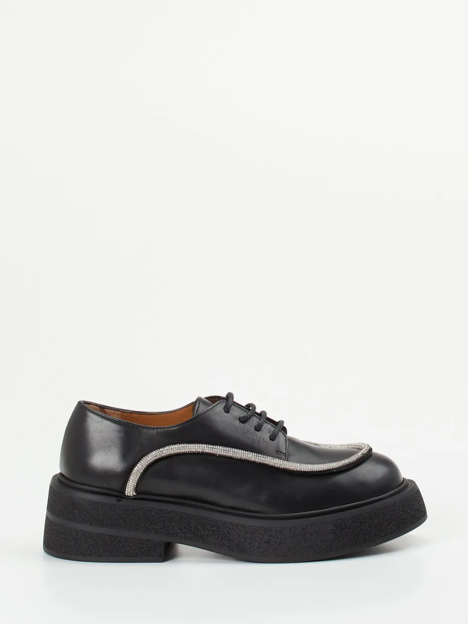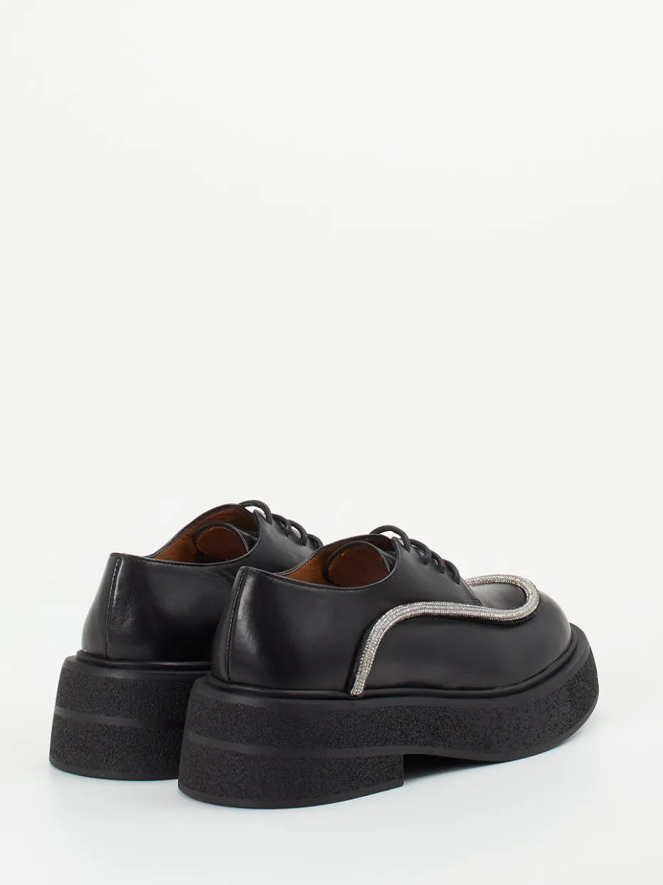 Ideal für freizeitorientierte Outfits mit starkem Stilfaktor: Das schwarze, halbmatte Kalbleder wirkt hochwertig und souverän. Gelungene Akzente setzt der silberfarbene Strassbesatz entlang der Außennähte und Zehenkappe. Die massiv geformte Plateau-Gummisohle ist offenporig strukturiert und fügt sich harmonisch in den aktuellen Chunky-Trend ein. Schnürung, klare Linien und Streetwear-Appeal machen dieses Modell besonders interessant für trendbewusste Trägerinnen. Harmoniert lässig zu Oversized-Blazern oder metallic-akzentuierten Taschen.