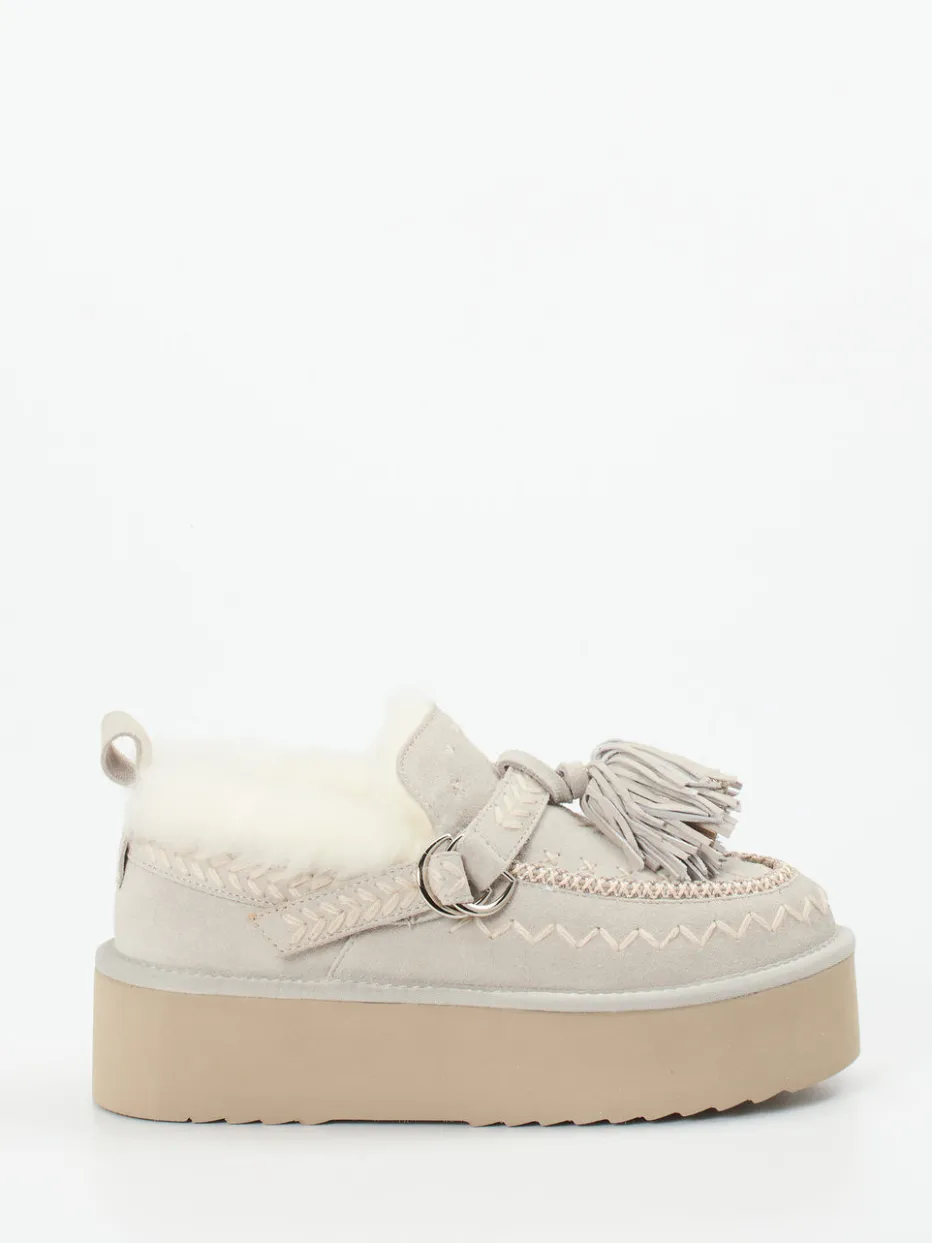 Der chunky Plateau-Loafer von Elena Iachi verbindet samtiges Veloursleder mit fein gearbeiteten Boho-Details und warmem Innenfutter – ideal für herbstlich-kühle Tage.