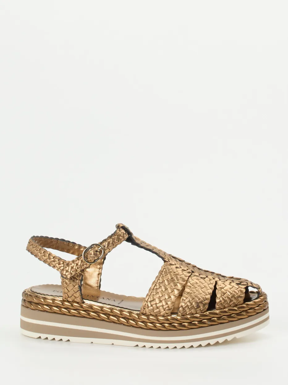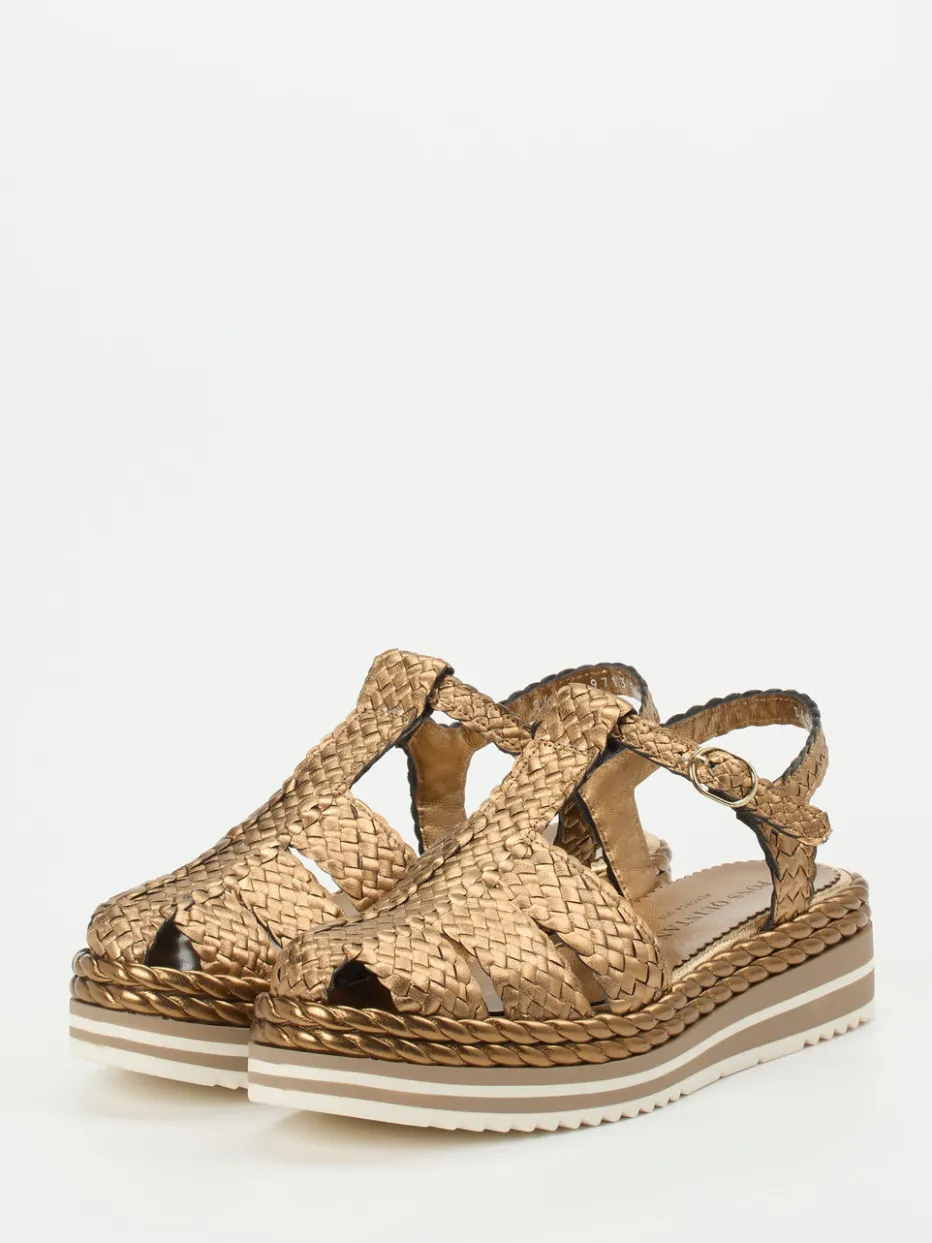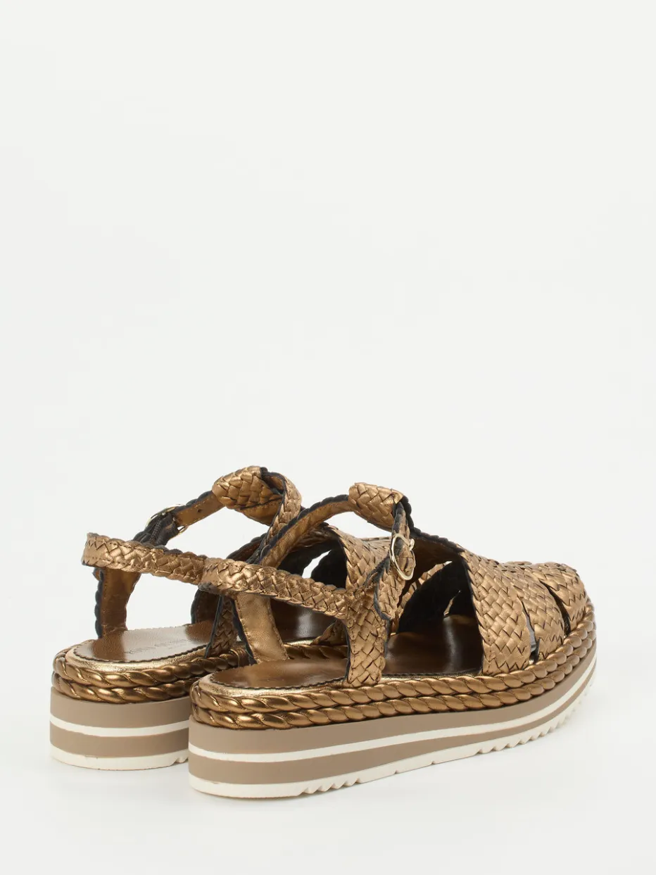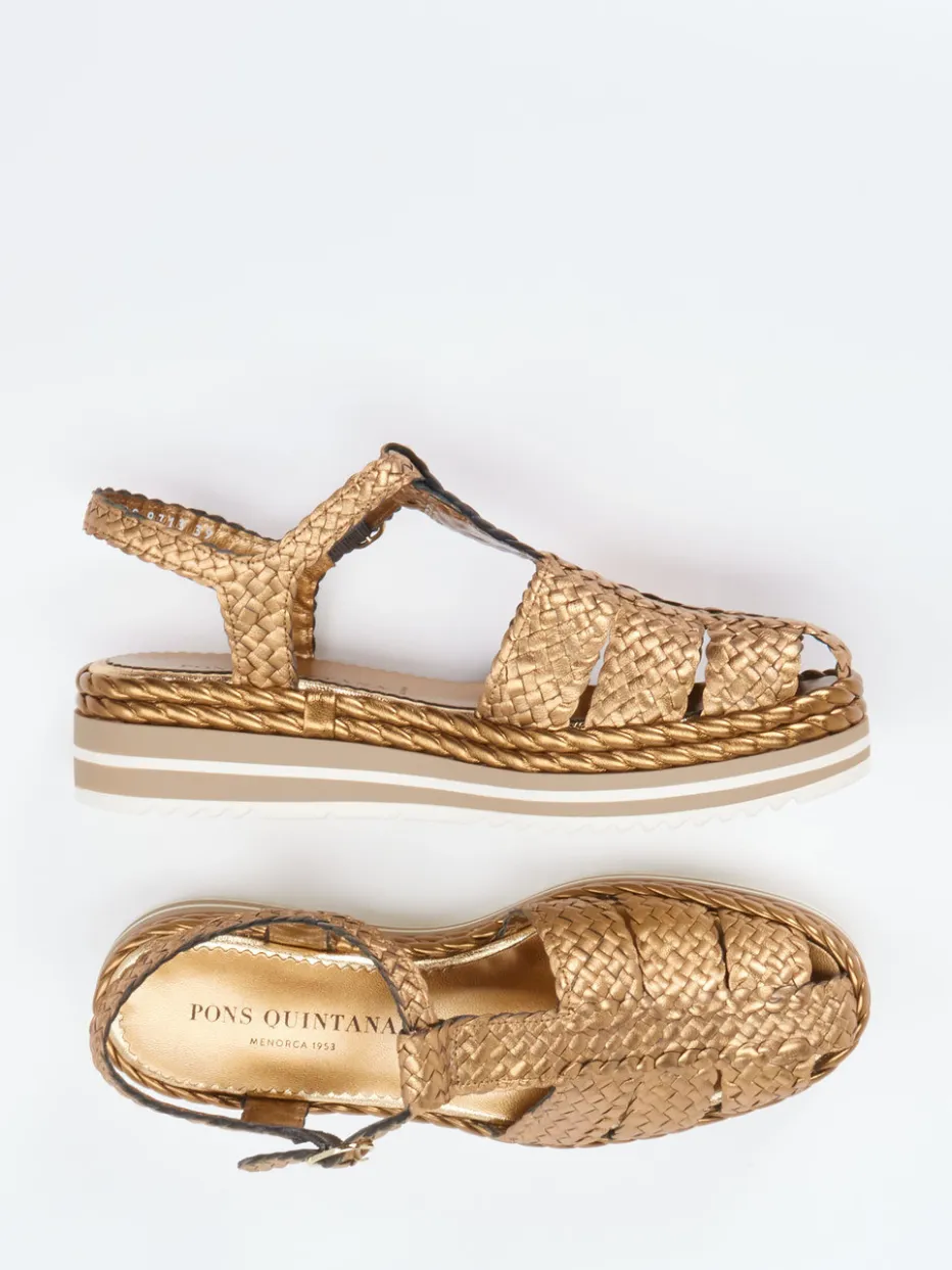 Geflochtenes, glänzendes Leder in Bronzegold und ein komfortables Plateau machen diese Pons Quintana Sandale zum stilsicheren Sommerfavoriten mit Boho-Charme.