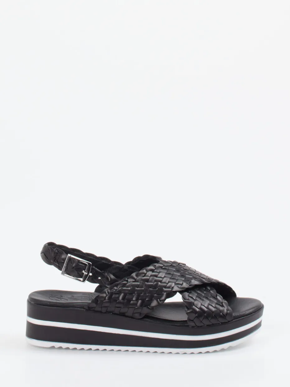Geflochtene Eleganz trifft Sommerkomfort.Die Damen-Plateau-Sandale von Oh!My Sandals verbindet zeitgemäßen Minimalismus mit durchdachtem Tragekomfort. Für entspannte Städtetrips oder sommerliche Ausflüge bietet das schwarze Flechtleder in matter Optik einen trendstarken Akzent. Überkreuzte Vorderfußriemen und ein verstellbarer Fersenriemen sorgen für sicheren Halt, während die Gummisohle mit weißer Kontrastlinie und Rillenstruktur zusätzlichen Grip bietet. Eine silberfarbene Schnalle rundet das Design formvollendet ab. Die integrierte Komfort-Gel-Einlage sorgt für weiche Auftritte bei urbanen Abenteuern oder am Strand. Kombiniert mit weiten Leinenhosen gelingt ein souveräner Casual-Look. Oh!My Sandals vereint spanisches Design mit funktionalem Stilgefühl und modernem Komfort.