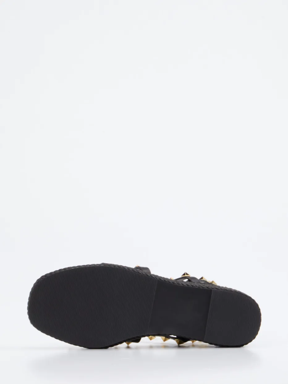 Diese Damen-Sandale überzeugt mit rockiger Optik und sommerlichem Komfort. Goldfarbene Pyramidennieten kombinieren sich mit strukturierter Plateausohle zu einem modischen Blickfang.