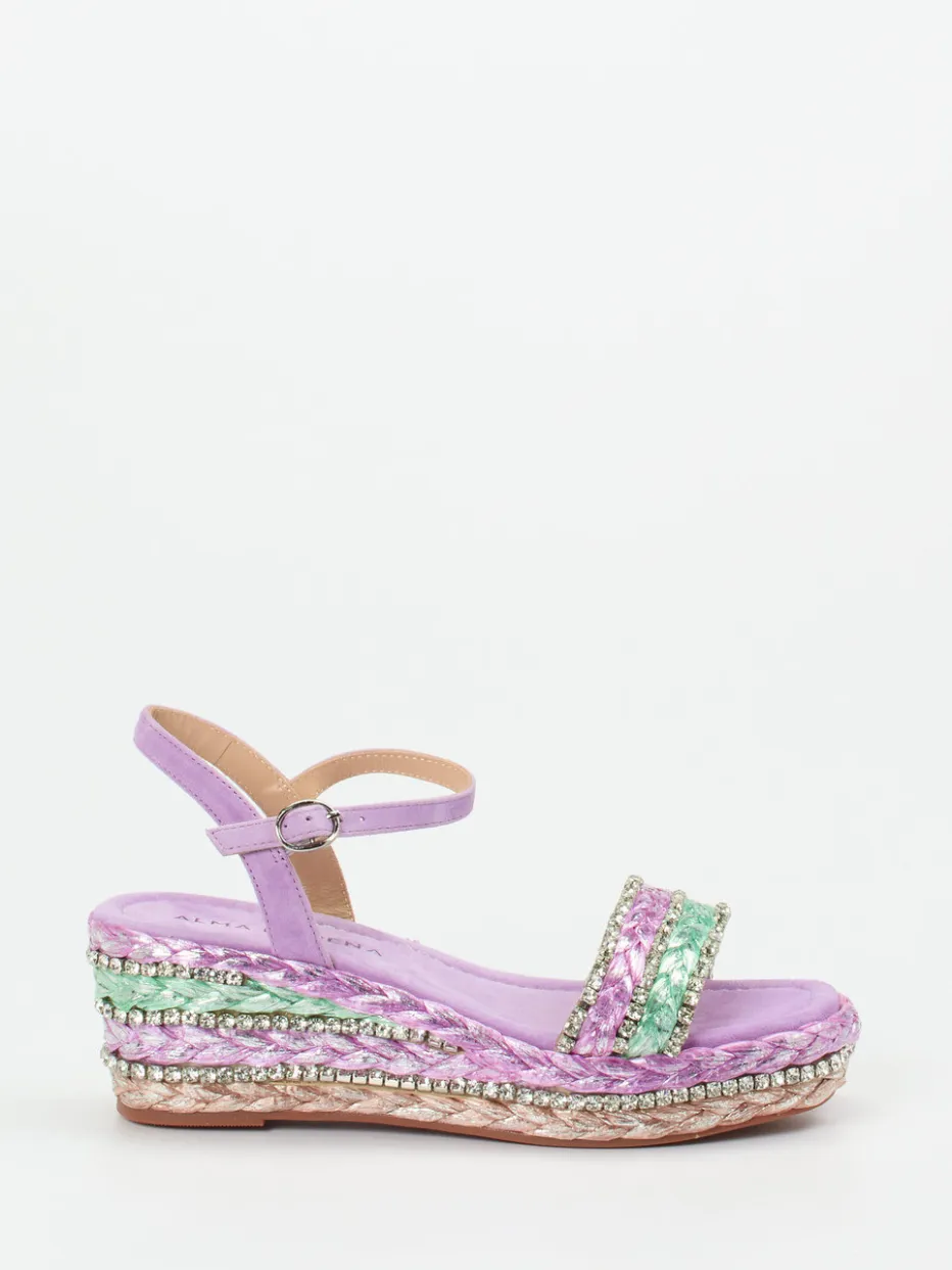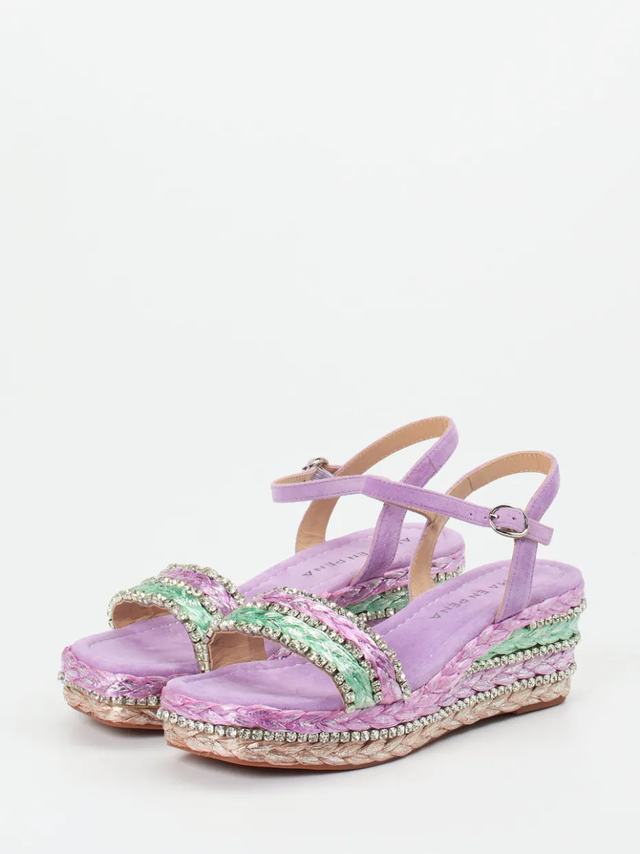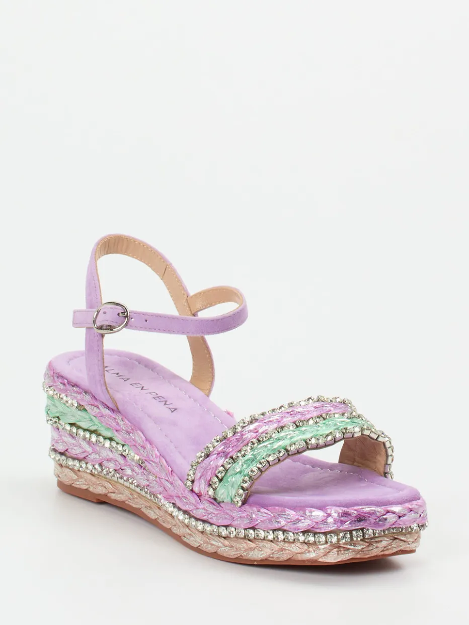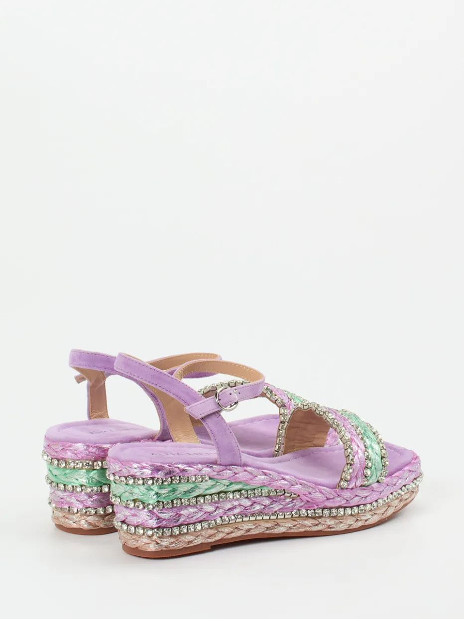 Boho-Glam für warme Nächte.Ralph Harrison präsentiert mit dieser Plateau-Sandale ein Modell, das Sommerfreude stilvoll unterstreicht. Ob Strandurlaub oder Rooftop-Abend – die weiche Velourslederbasis in mattem Flieder sorgt für angenehmen Tragekomfort, während die pastellfarbenen, bastartig geflochtenen Textilriemen ein luftig-verspieltes Flair erzeugen. Glitzernde Strasssteine entlang der Riemen und Sohlenseiten setzen glamouröse Highlights im Stil der Y2K-Ästhetik. Die plateauförmige Silhouette mit Gummisohle verbindet modische Höhe mit Alltagstauglichkeit. Der ideale Begleiter für stilbewusste Auftritte in angesagten Sommerfarben mit expressiver Note.