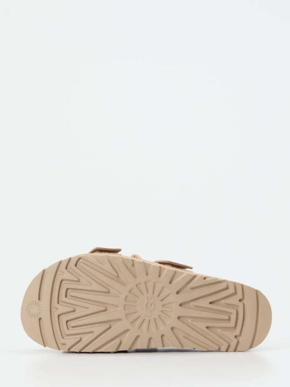 Die offene Plateau-Silhouette und das samtige Veloursleder verleihen dieser UGG-Sandale einen modernen Utility-Charakter mit sommerlichem Komfortanspruch.