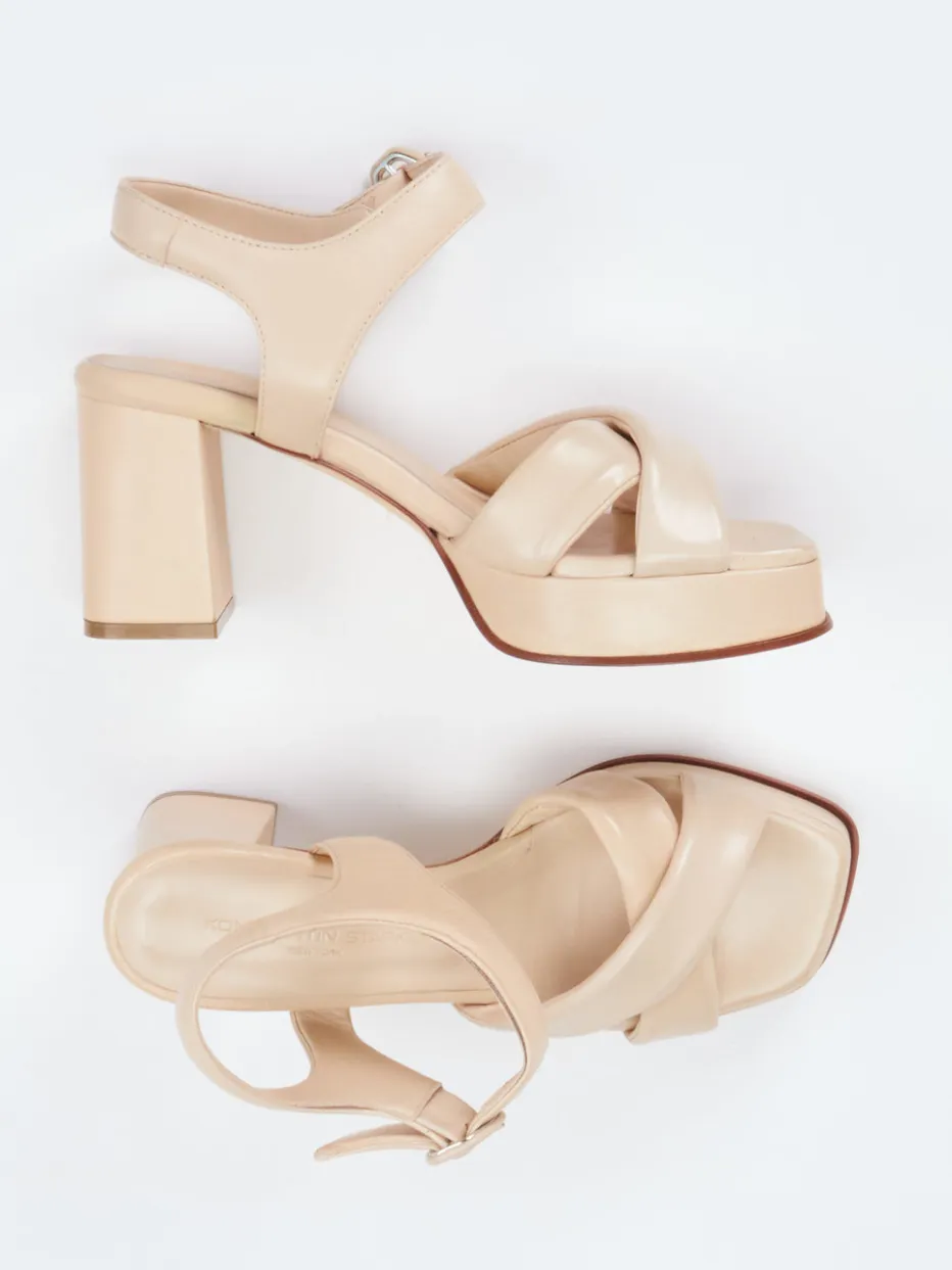 Sommerlicher Minimalismus mit Retro-Note.Die Marke Konstantin Starke zeigt mit dieser Plateau-Sandalette ein stilvolles Modell für anspruchsvolle Sommerlooks. Ob beim Stadtspaziergang oder abends auf der Terrasse – das beigefarbene Lammleder mit matter Oberfläche und fein glänzenden Kanten wirkt hochwertig-modern. Rückenschonend und tragesympathisch: der gepolsterte Kreuzriemen und ein individuell regulierbarer Knöchelriemen mit Metallschnalle. Blockabsatz und 2,5 cm hohes Plateau bringen klaren 70s-Charme in den Alltag. Leicht kombinierbar zu leichten Sommerkleidern in Naturtönen. Design mit Komfort – Konstantin Starke verbindet Modeanspruch und Tragbarkeit.