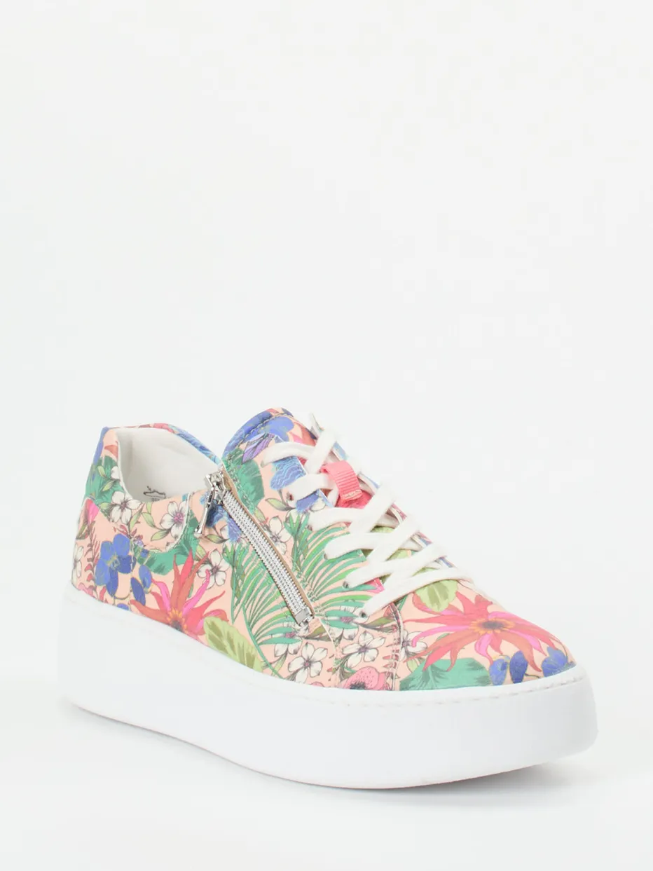 Sommerleicht und floral ins Outfit starten.Waldläufer interpretiert den Plateau-Sneaker in femininer Formgebung mit floralem Print auf geprägtem Leder – ideal für aktive Tage. Die in Pfirsichrosa gehaltene Oberfläche bringt mit ihrem floralen Allover-Muster und den frischen Akzenten in Pink und Blau eine sommerliche Leichtigkeit. Die komfortable H-Weite, gepolsterte Innenausstattung mit Wechselfußbett sowie ein silberfarbener Seitenreißverschluss sorgen für funktionale Alltagstauglichkeit. Eine weiße Plateausohle mit rutschfester Struktur ergänzt den Retro-Feminin-Look stilgerecht. Gut kombinierbar zu pastellfarbenen Freizeit-Outfits. Ein stilvoll-bequemer Begleiter mit farbintensivem Auftritt – typisch Waldläufer.