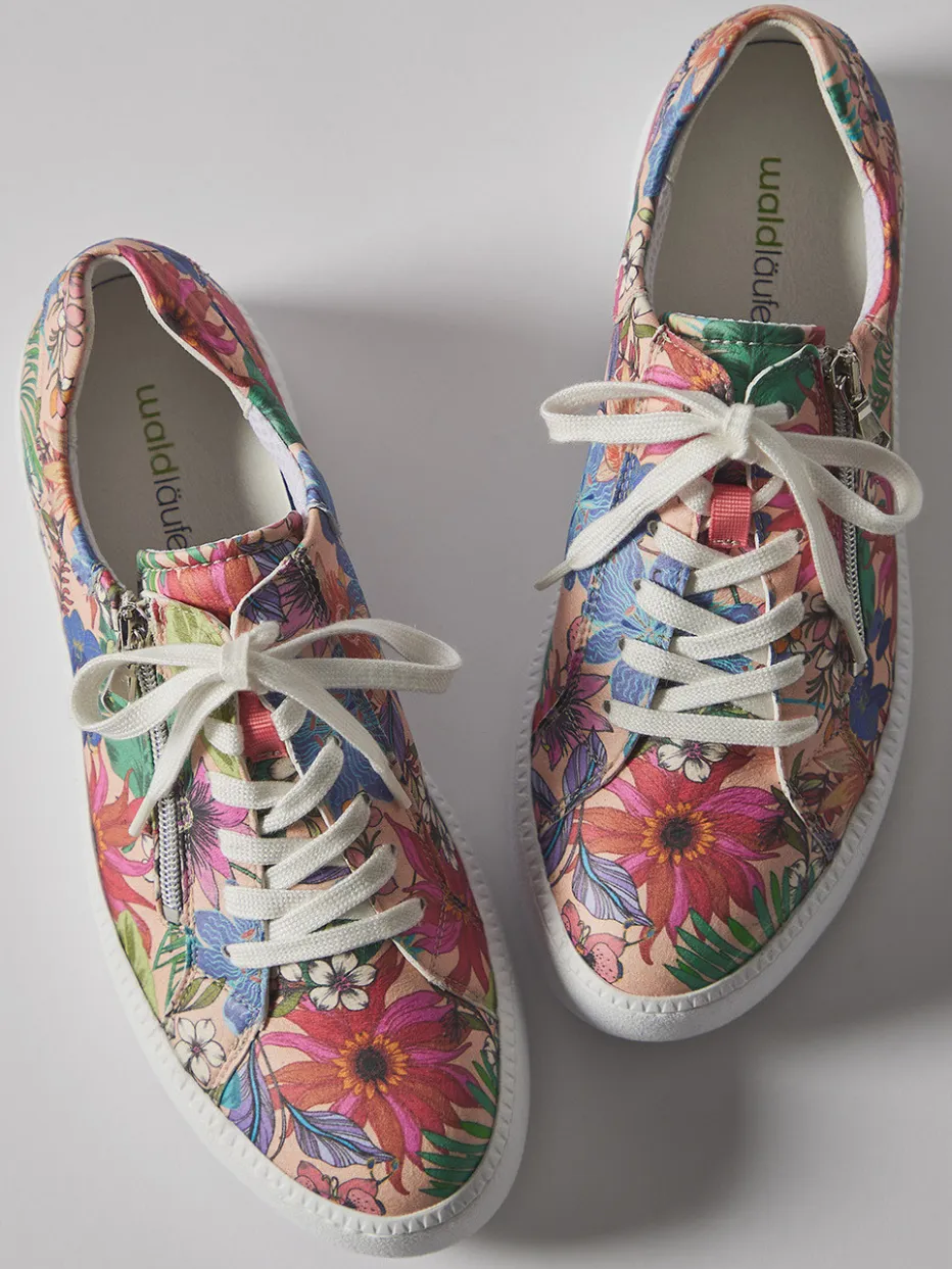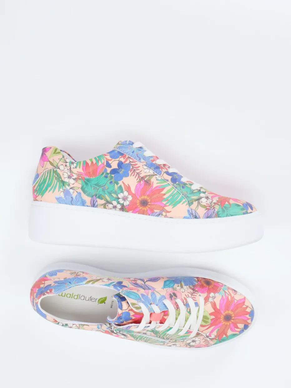 Dieser Plateau-Sneaker von Waldläufer vereint florales Design mit praktischem Komfort. Hochwertiges Leder, individuelle Passform und sommerliche Farbtöne sprechen stilbewusste Trägerinnen an.